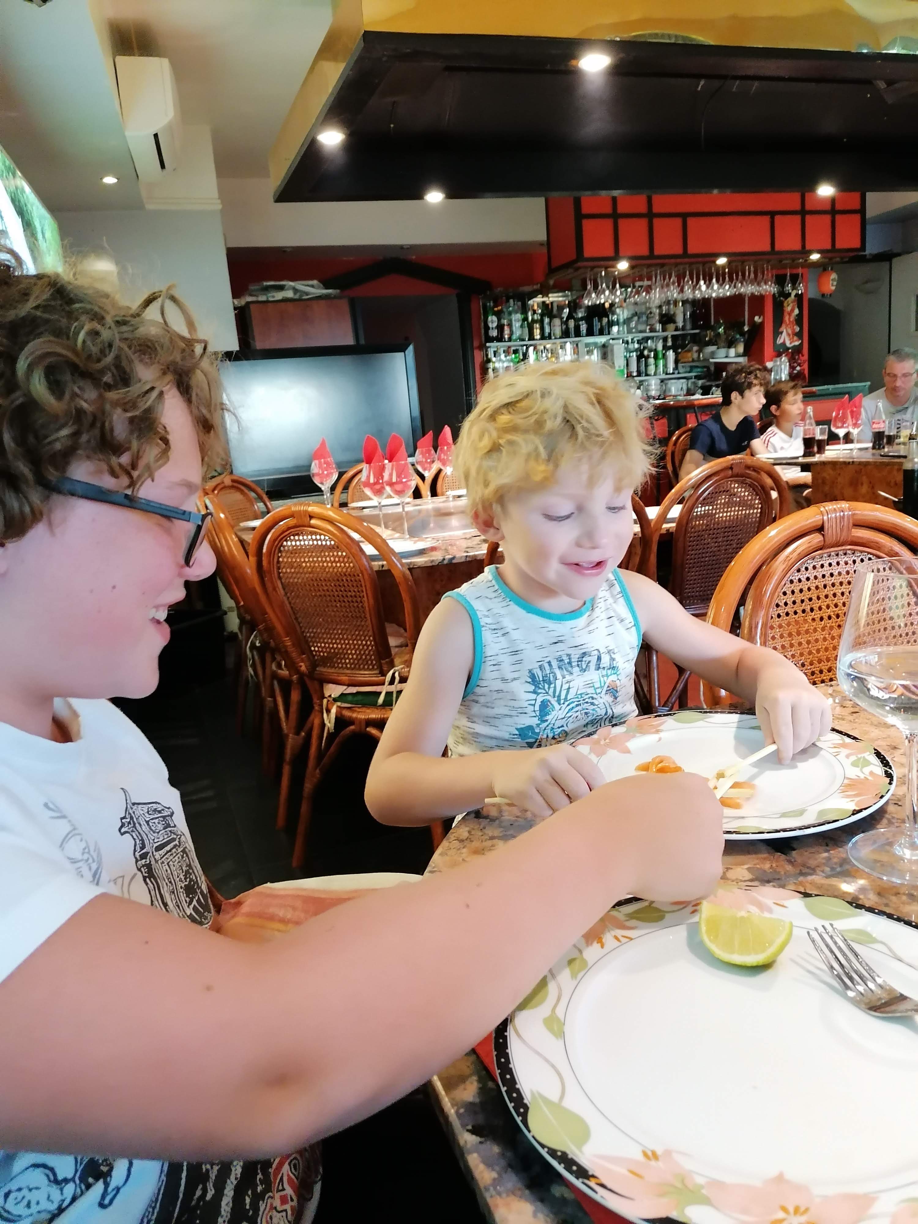 Restaurant très sympa. L'ambiance est très détendu et humouristique avec un chef aimant faire des blagues (qui pour ma famille et moi étaient très drôles). C'est super bon et super spectacle de voir les aliments cuire devant nous ! Les bémols sont que le temps d'attente est un peu long. Le chef doit passer de table en table .. MAIS l'attente vaut le goût du plat ! Déplus, la quantité peut paraitre un peu juste. 3/4 avaient encore un peu faim à la fin du repas. Pour les plus petits estomacs je recommande !