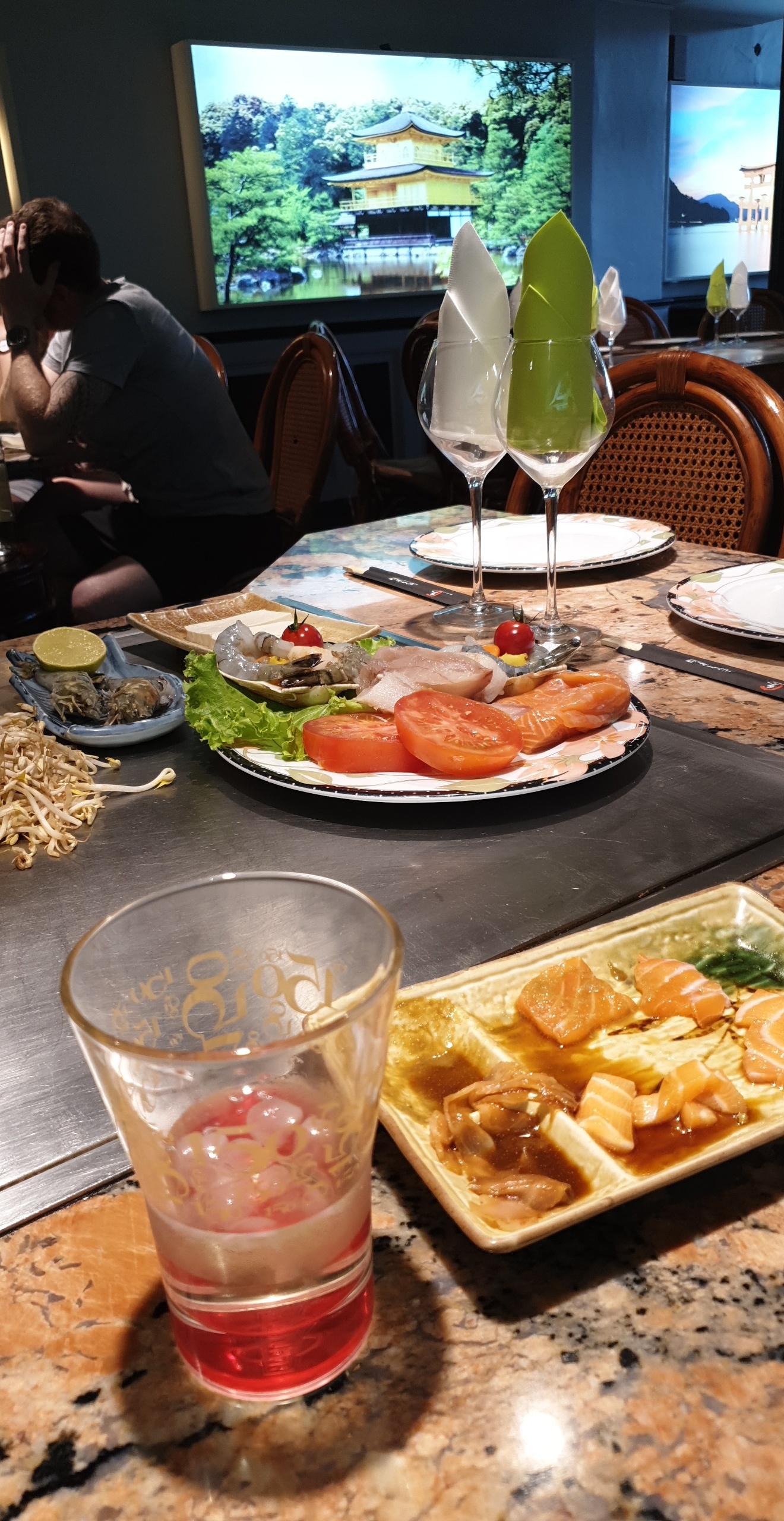 Accueil froid, salle à la décoration typique des restaurants chinois (et pas japonais), 9 chaises tres tassées autour de chaque table de cuisson ( impossible d'avoir une conversation privee) , les coussins sur les chaises sont usés, sales et déformés. Ça c'est pour l'aspect du lieu. Un seul cuisinier pour toutes les tables, temps de repas très long. Il se croit drôle à débiter des blagues douteuses, sexistes ou racistes à longueur de temps, c'était infernal, je n'avais qu'une envie c'était de partir. Pour donner un exemple supplémentaire c'était l'anniversaire de deux jeunes femmes à des tables différentes, il leur a amené en fanfare une assiette contenant une banane encadree de deux boucles de glace. Voilà pour le genre d'ambiance. Niveau très en dessous de la ceinture. A fuir et c'est dommage car la cuisine n'était pas si mauvaise.