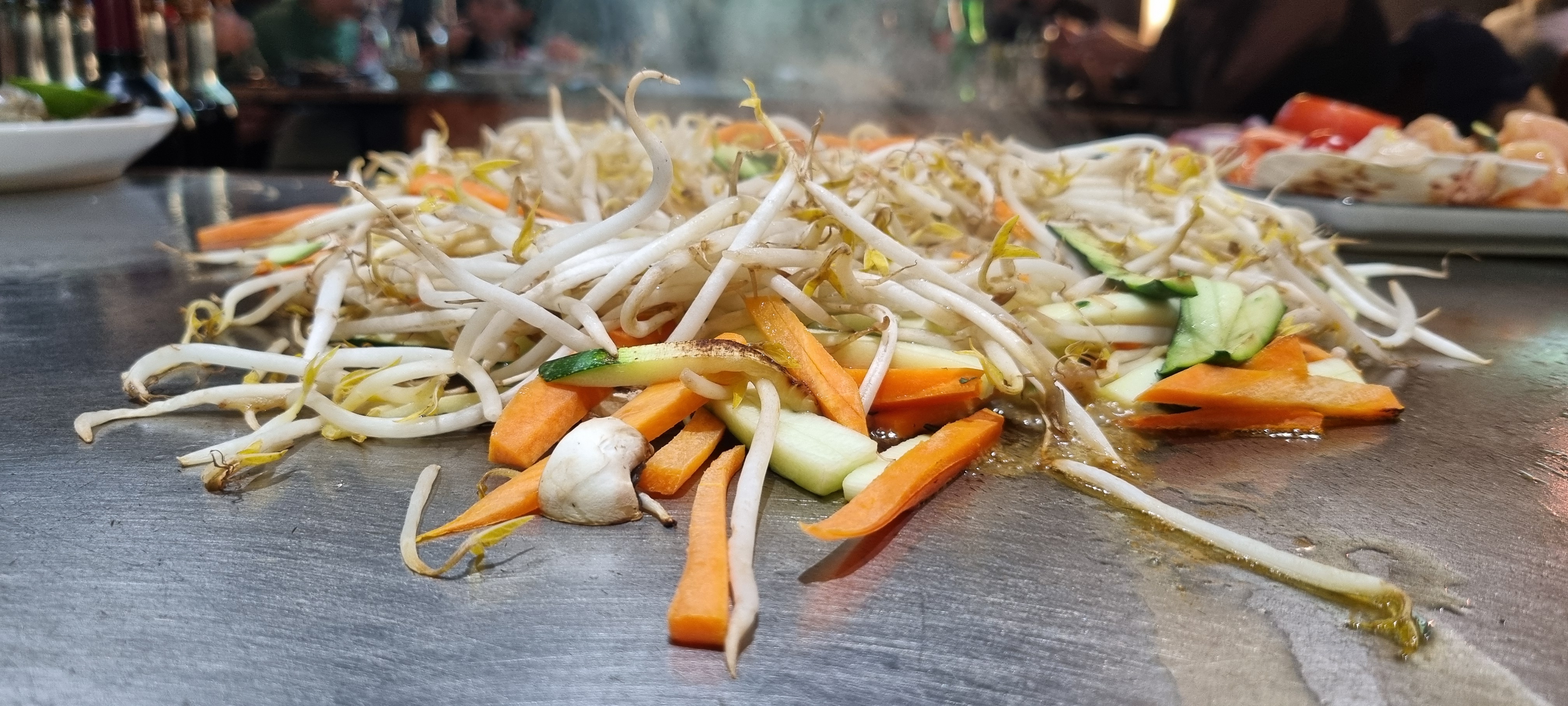 Spectacle assuré, on mange très bien. Petite réserve concernant les oublis, ou le riz qui arrive en fin de repas, alors que l'on a fini fruits de mer et viande. Mais la gentillesse du chef et des personnes compense.
