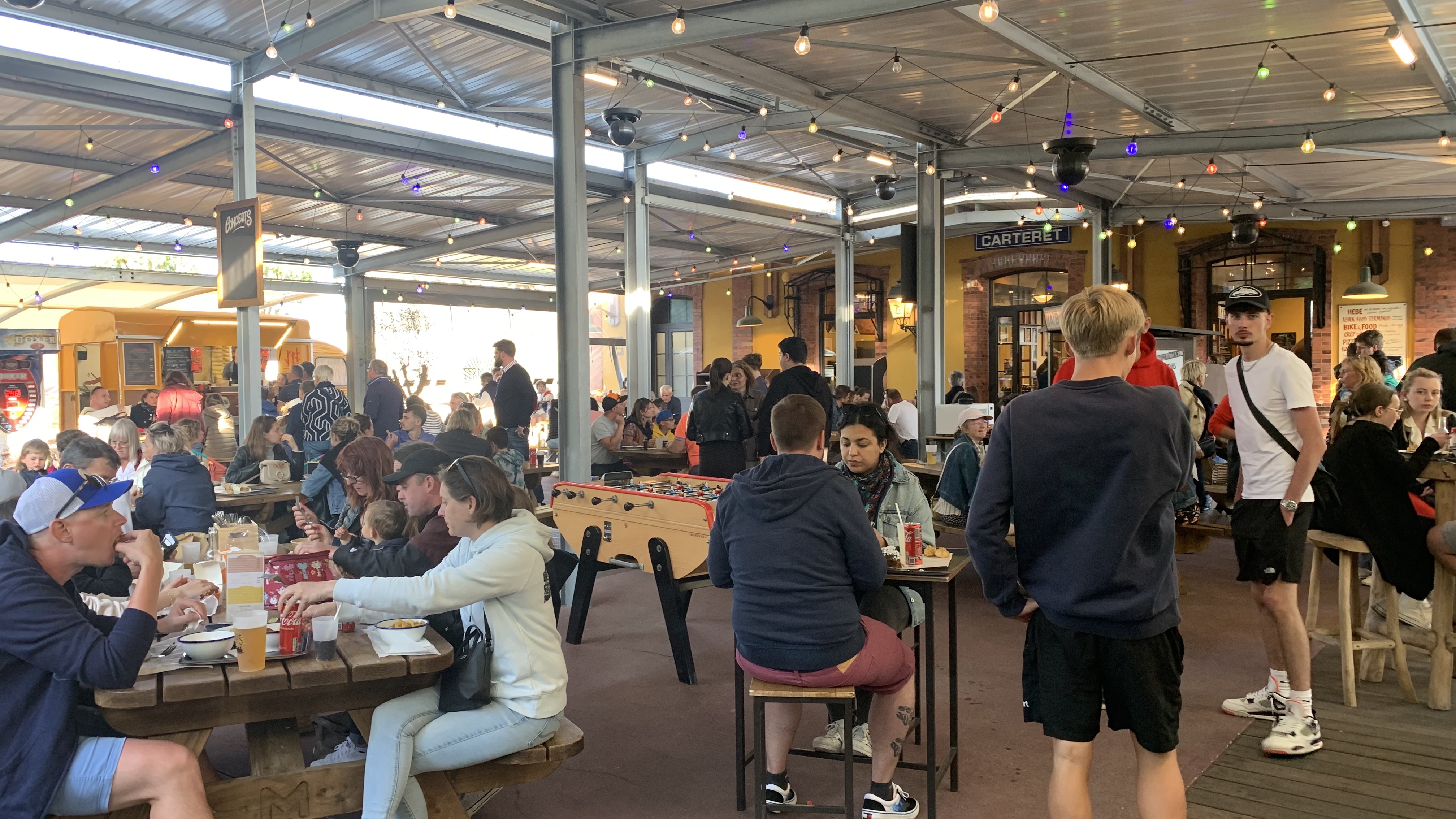 Lieu original et convivial situé dans l' ancienne gare de la charmante ville de Carteret. De la restauration rapide grâce aux différents food trucks qui proposent plusieurs types de gastronomie du plat végétarien en passant par le burger accompagné de bonnes frites maison ,l'asiatique, de délicieux burgers de homard frais, ou des plateaux de fromage et de charcuterie locales(excellente provenant des des Jambons de Lessay👍) ou encore des plateaux de fruits de mer. Concept inventif et une sortie qui convient à toutes les tranches d'âge sauf à ceux qui veulent être servis et assis au calme et seuls dans un endroit feutré 😜 Le plus serait de faire venir des groupes de musique le soir 🎷🎸🎹🎤🎶🎶
