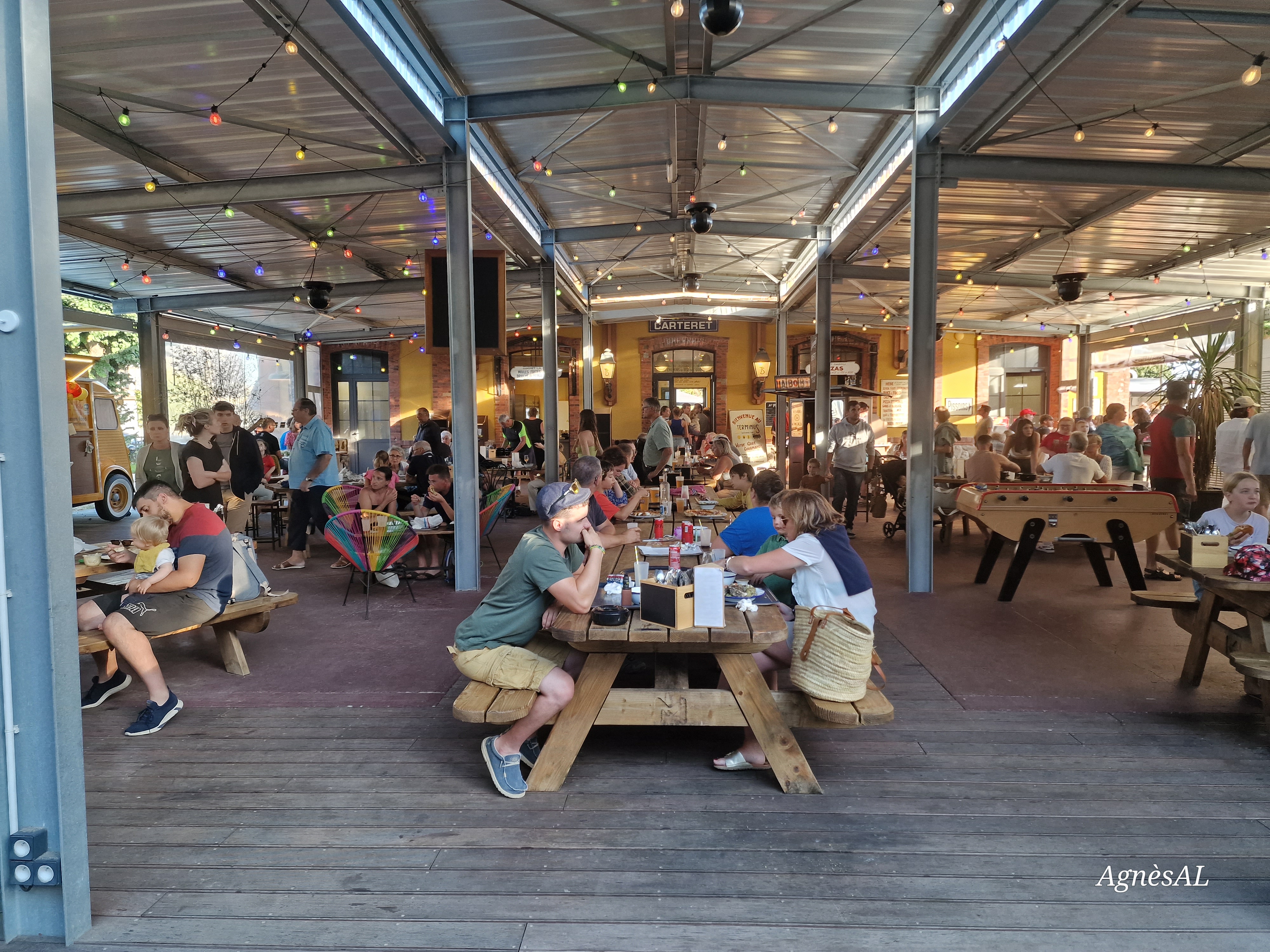 Concept original avec différents food trucks disposés en cercle autour des tables dans un lieu couvert attenant à l'ancienne gare. Large choix de type de nourriture (il y en a pour tous les goûts) suivant que l'on se dirige vers l'un ou l'autre, plaît visiblement aux jeunes mais aussi aux moins jeunes dont nous faisons partie.