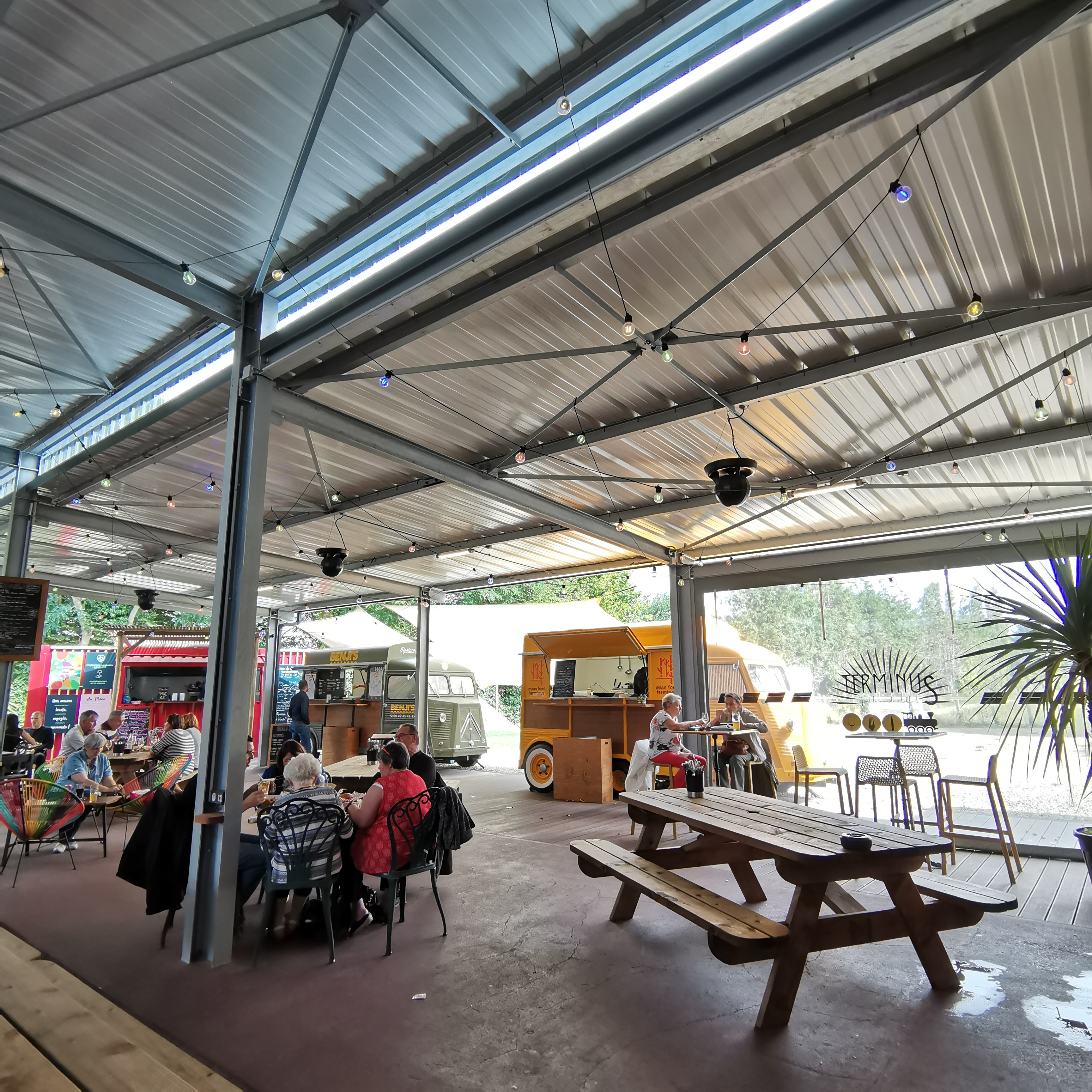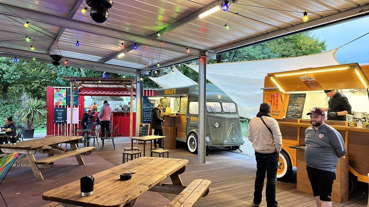 Lieu convivial, original, entouré de food trucks proposant une cuisine variée