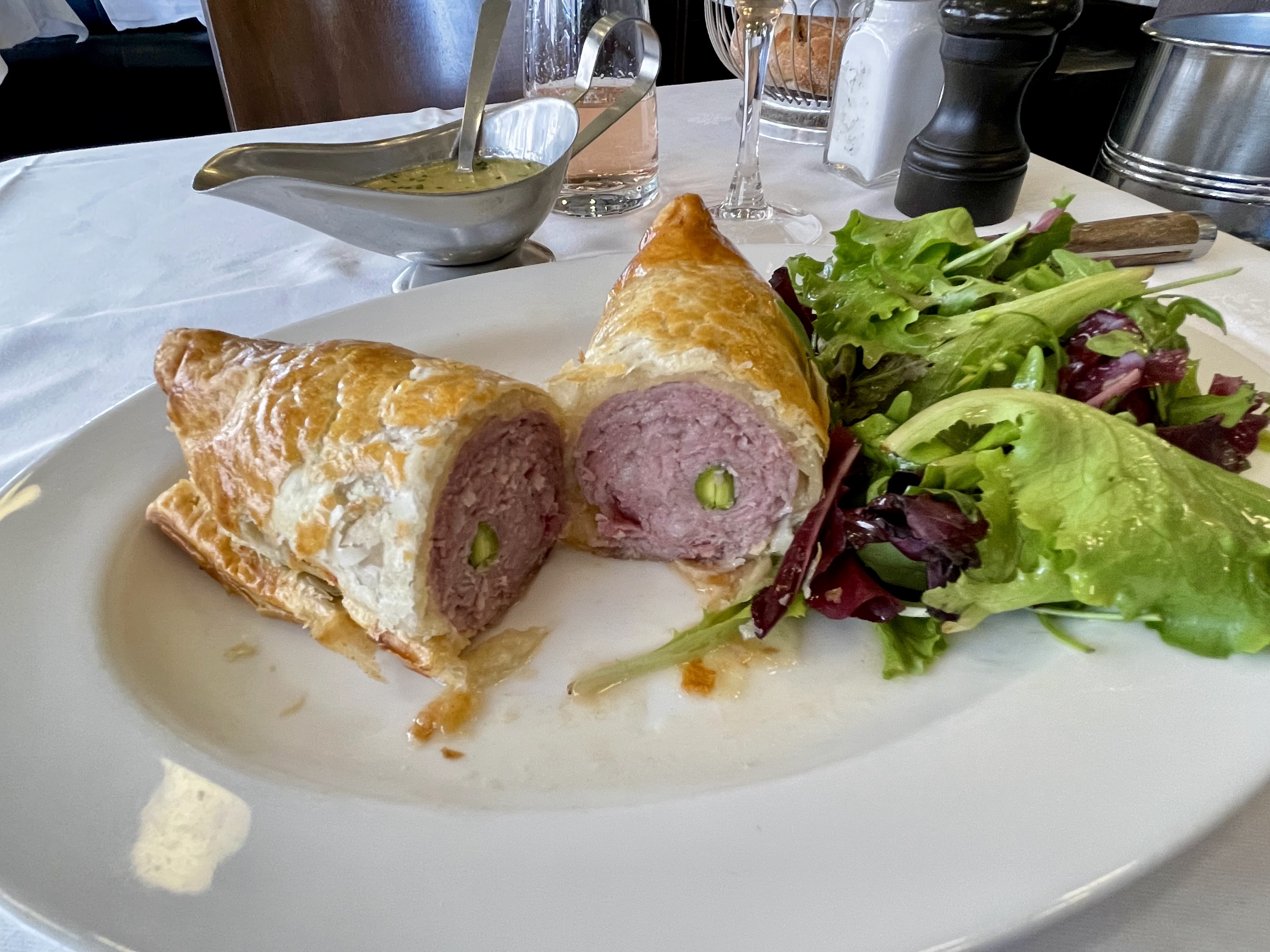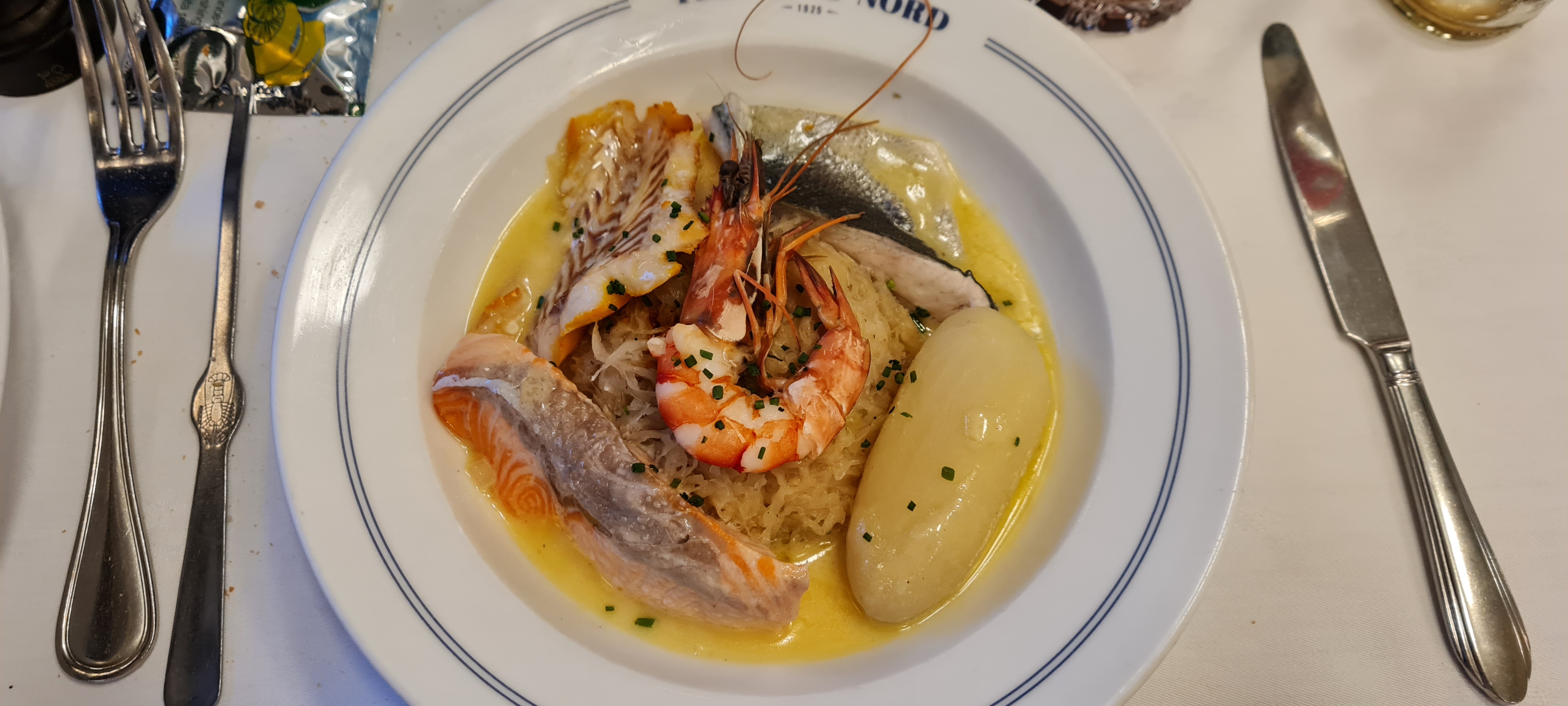 Nous avions 3 heures à tuer entre notre arrivée en Eurostar de Londres et le départ pour Europa Park et comme c'était mon anniversaire, nous voulions faire une halte sympa, nous n'aurions pas pu choisir mieux, nous avions beaucoup de bagages mais il y avait un espace pour les articles plus volumineux, le service était extrêmement sympathique et serviable pour les francophones limités, alors j'adore avoir la simplicité d'un bon pain, réapprovisionné tout au long du repas, qui manque malheureusement au Royaume-Uni ces jours-ci la plupart du temps, de fabuleux raviolis au fromage et à la crème et une soupe de poisson pour début suivi d'une choucroute de poisson mélangée et d'un fish and chips, tous délicieux joliment présentés et servis par des serveurs des plus délicieux arrosés d'une demi-bouteille de pinot noir, d'eau et d'une boisson gazeuse pour environ 100 £ sterling (116e)