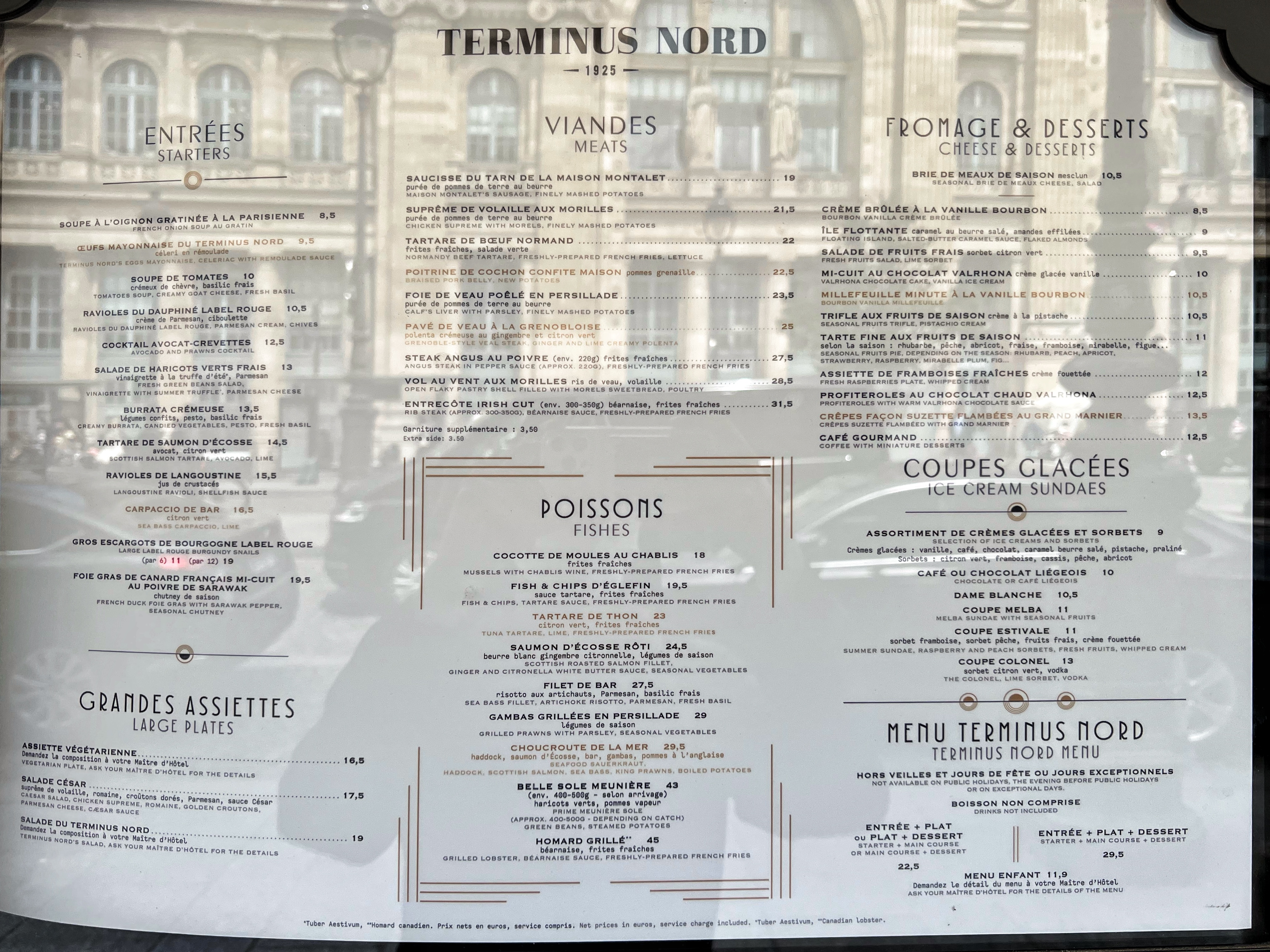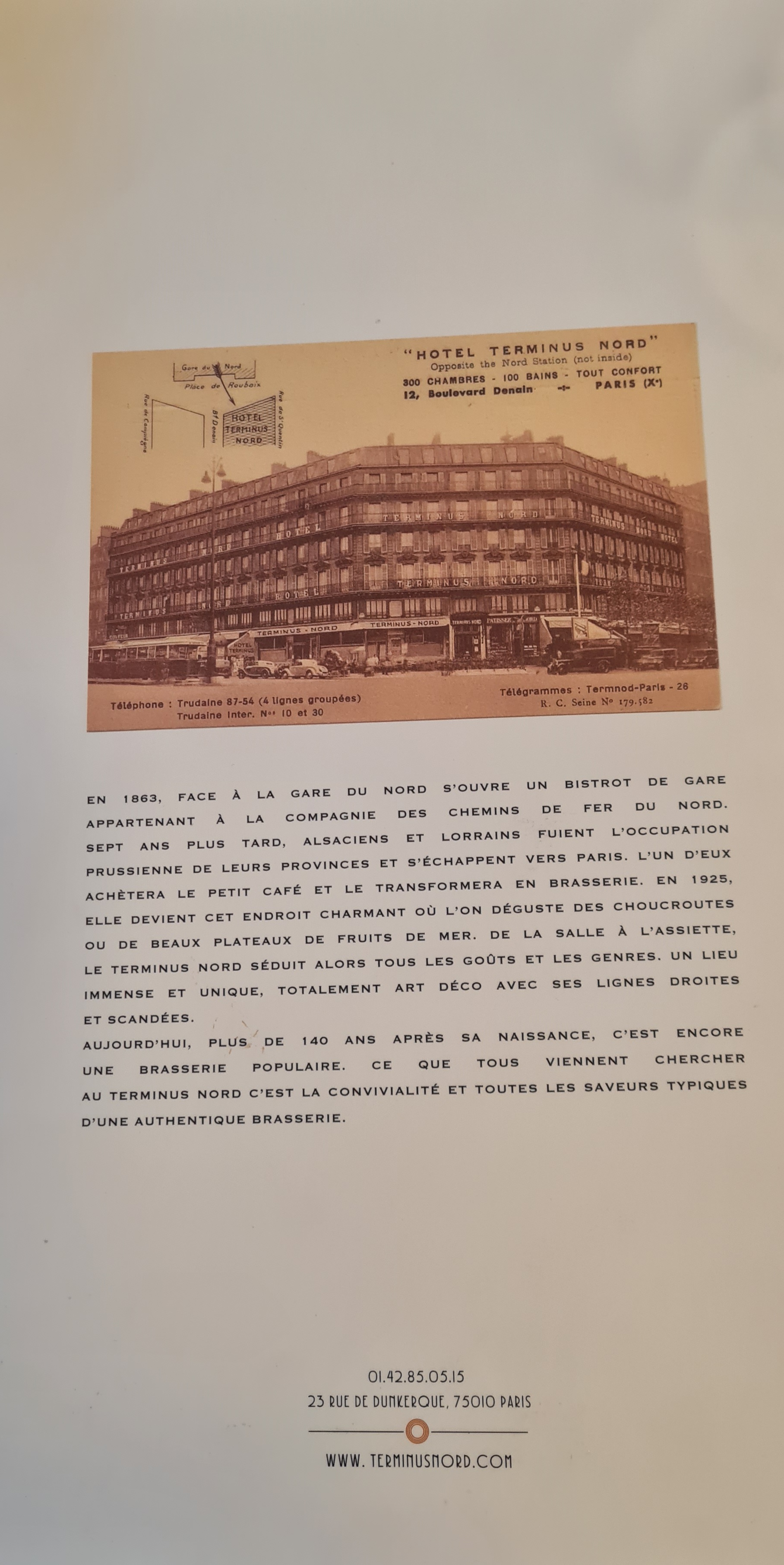 TERMINUS NORD (depuis 1925) est une brasserie parisienne en face de la gare du Nord à Paris : un endroit fort sympathique pour déguster de bons plats style brasserie...ou boire un verre ...tout en attendant son train. Accueil professionnel et service soigné; très bel intérieur style brasserie parisienne ; grande terrasse couverte