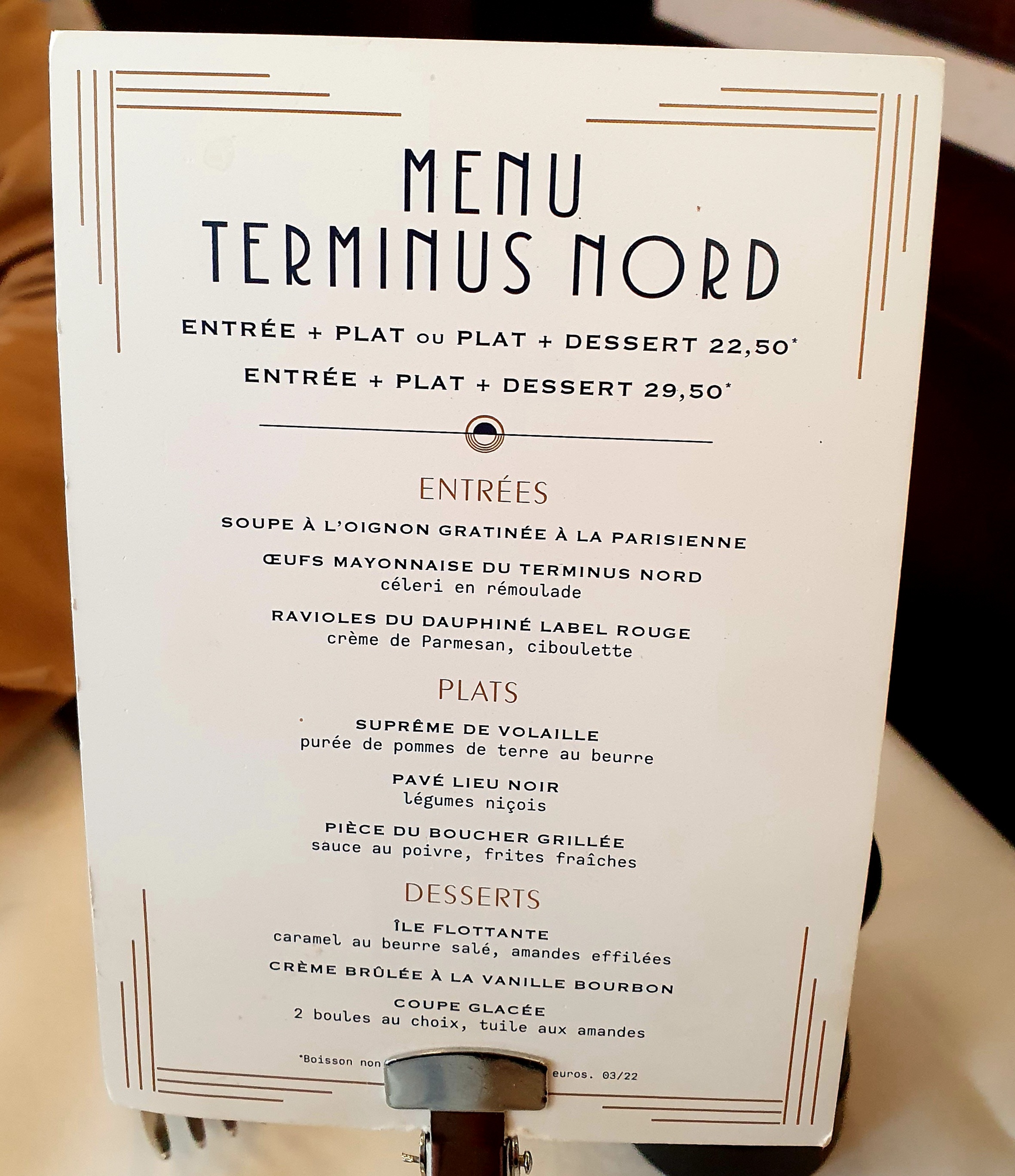 Petits déjeuners, menus déjeuner en semaine, fruits de mer... Dans la carte de grande brasserie parisienne on ne peut plus classique, il y a le saucisson pistaché. Bien servi, pas exceptionnel mais qui fait plaisir en bouche. Sans oublier les œufs mimosa de la maison et leur délicieuse crème à la moutarde à l’ancienne. Le pichet n’est pas un Bordeaux rouge moyen : choix très convenable. Un attente entre les plats qui reste raisonnable. Les voyageurs peuvent cependant garder l’œil sur l’écran qui affiche les horaires des trains. On vient aussi pour le décor exceptionnel. Sens de l’accueil, professionnalisme et sourire sont au rendez-vous.