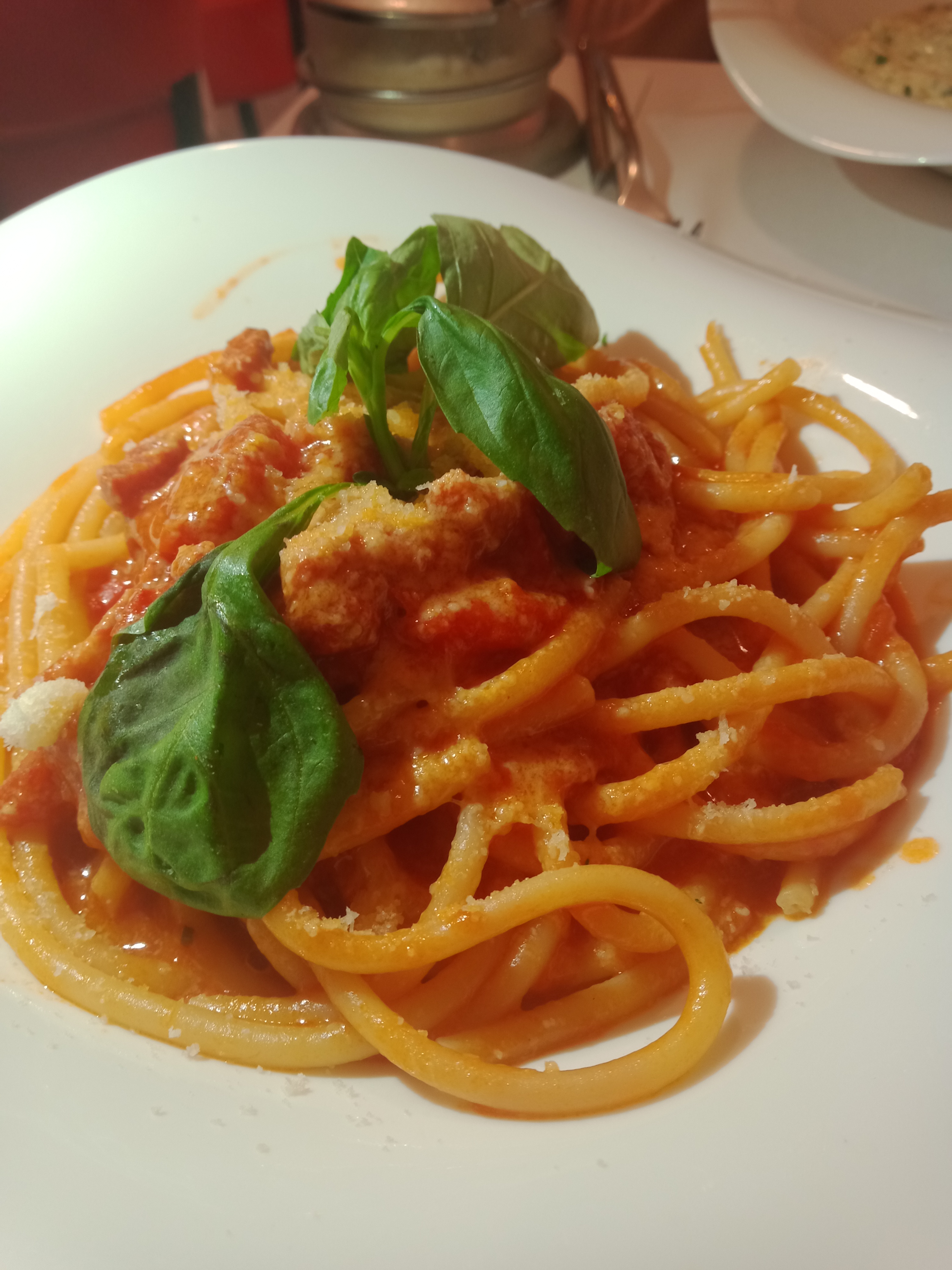 Le personnel est accueillant et souriant ce qui est agréable. La déco est chic et simple. J'ai prit les bucatini et le plat de pâtes était bien servit et bon.