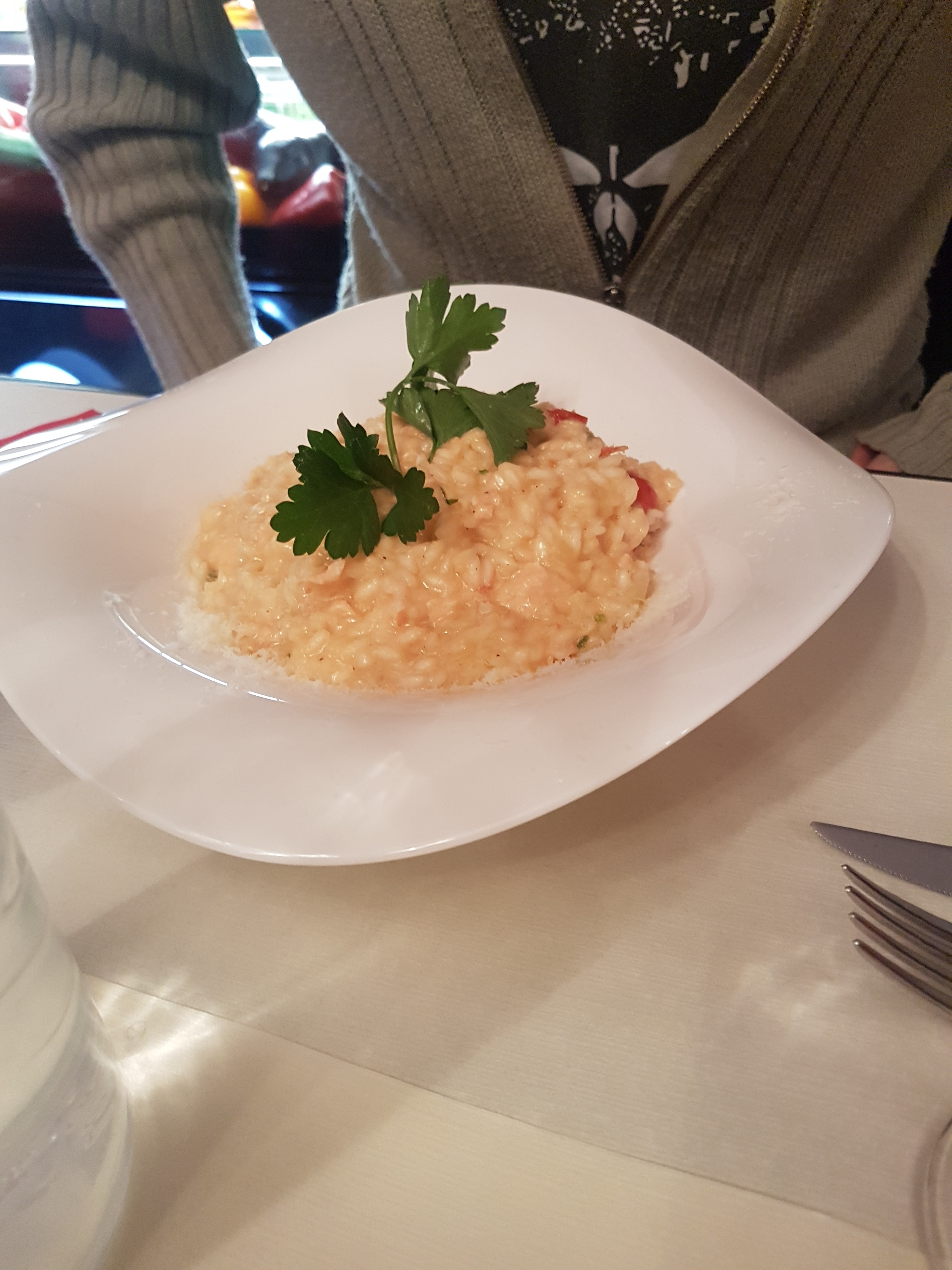 Nous y sommes allés à 4 (2 couples d'amis) trois risotto succulents etune assiette d'espadon + un vin excellent. Les desserts à tomber par terre. rien à redire c'est la perfection !! Merci.