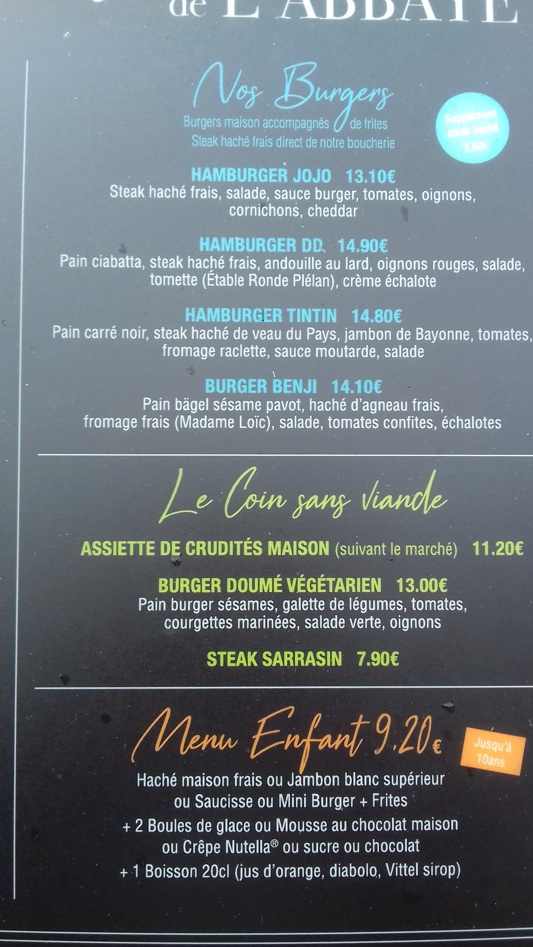 Nous avons très bien mangé. Le burger du menu enfant était vraiment bon, ça change des menus enfants des autres restos. Serveur très sympathique. Je recommande le dessert de l’abbaye, excellent !