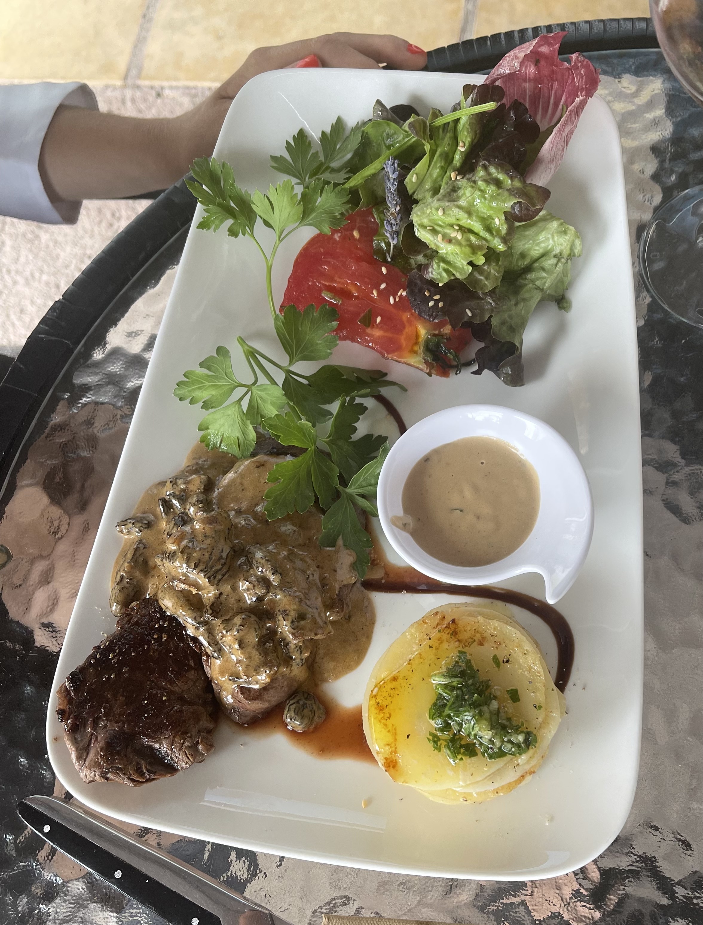 Habituée à ce lieux (pour de belles occasions a sortir) jamais déçue et même quand le chef Tony n'est pas là (cas de force majeur et repos) il à su trouver 1 jeune super en salle (releve assurée !! ) Personnellement mes gouts me font préfèrer ce restaurant l'hiver, mais en été les plats sont appréciés par leur légèreté et originalités qui vont très bien pour: chaleur et vacances. Carte de visite à garder (n'oubliez pas de réserver, peu de table et prisé ) 👍