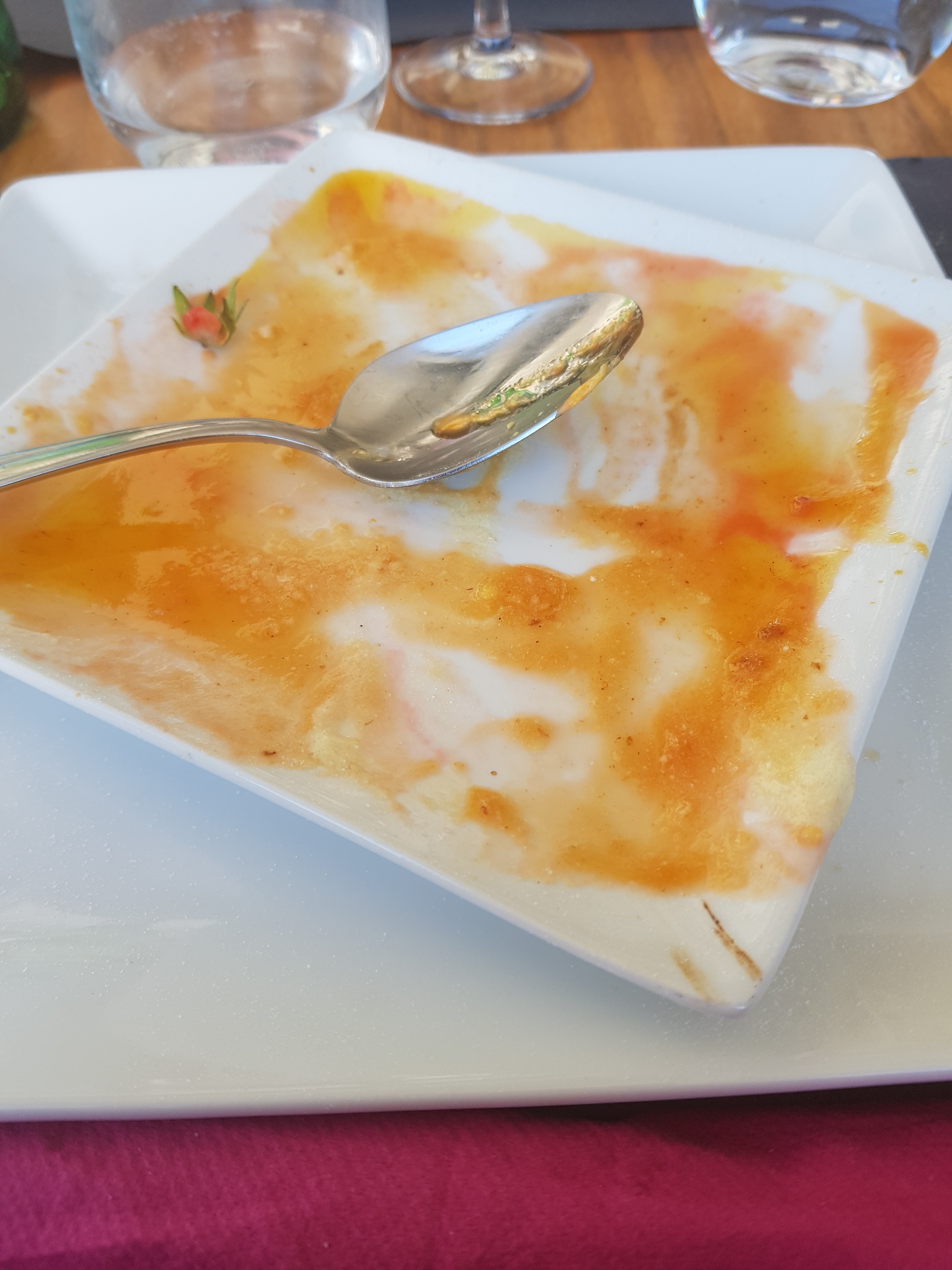 1er dîner sur l'île. Restau familial tenu par le couple. Décor trop froid/blanc à mon goût mais assiettes goutues: assiette apero surprise avec 1 huitre chaude et gougère, puis palourdes sauce cresson, un régal ++ puis poisson cuisson excellente bien sur (dommage les p de t étaient sèches...je les préfère vapeur). Le dessert très bon et joli mais c'est trop copieux un Menu complet le soir pour tout apprécier. (Mais à la carte les prix font reculer sur l'ile).