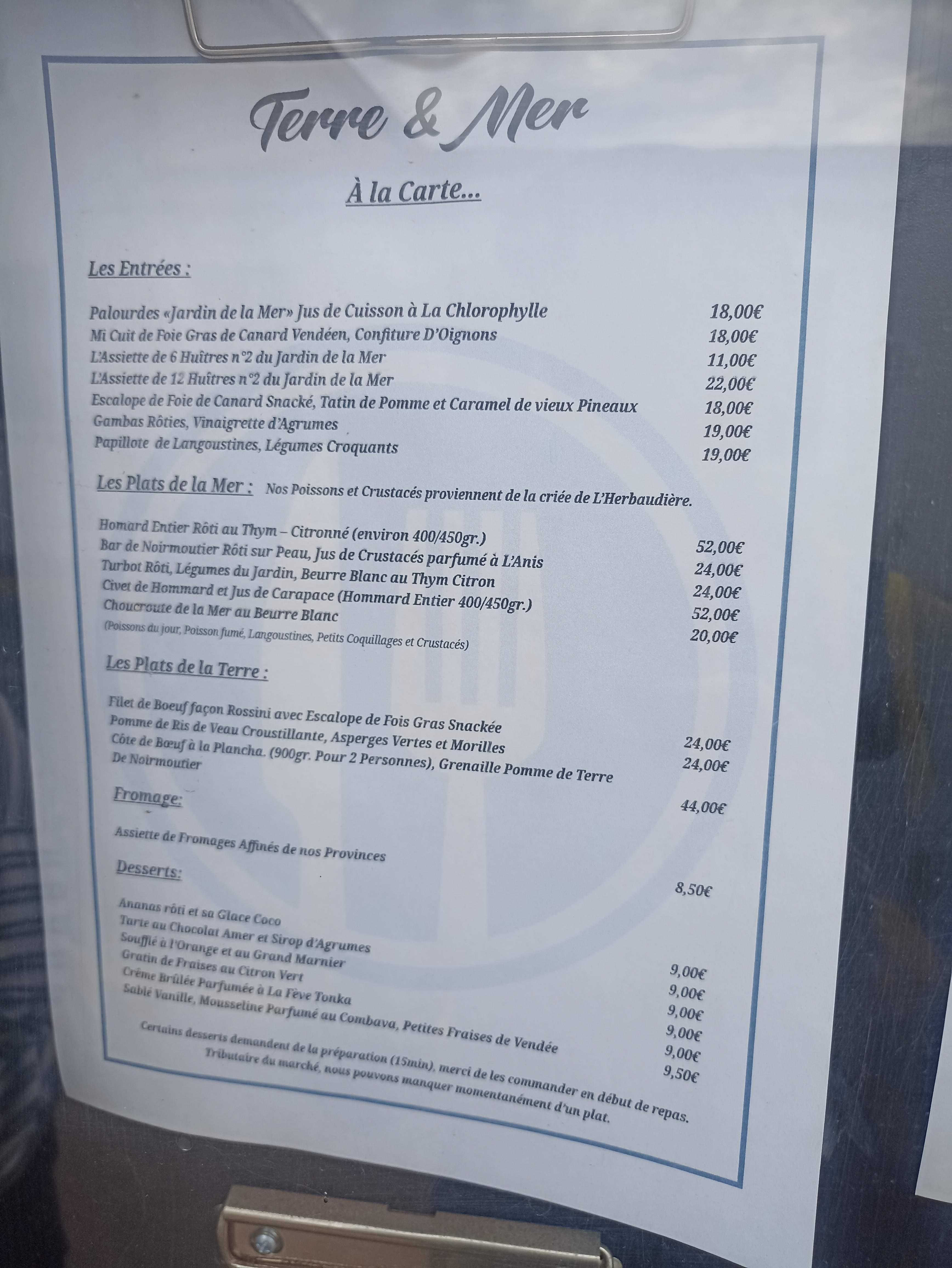 Si vous séjournez ou simplement passez par Noirmoutier, faites une halte repas au restaurant Terre et Mer. Cuisine raffinée, recherchée et gustative, le tout dans une ambiance chaleureuse.