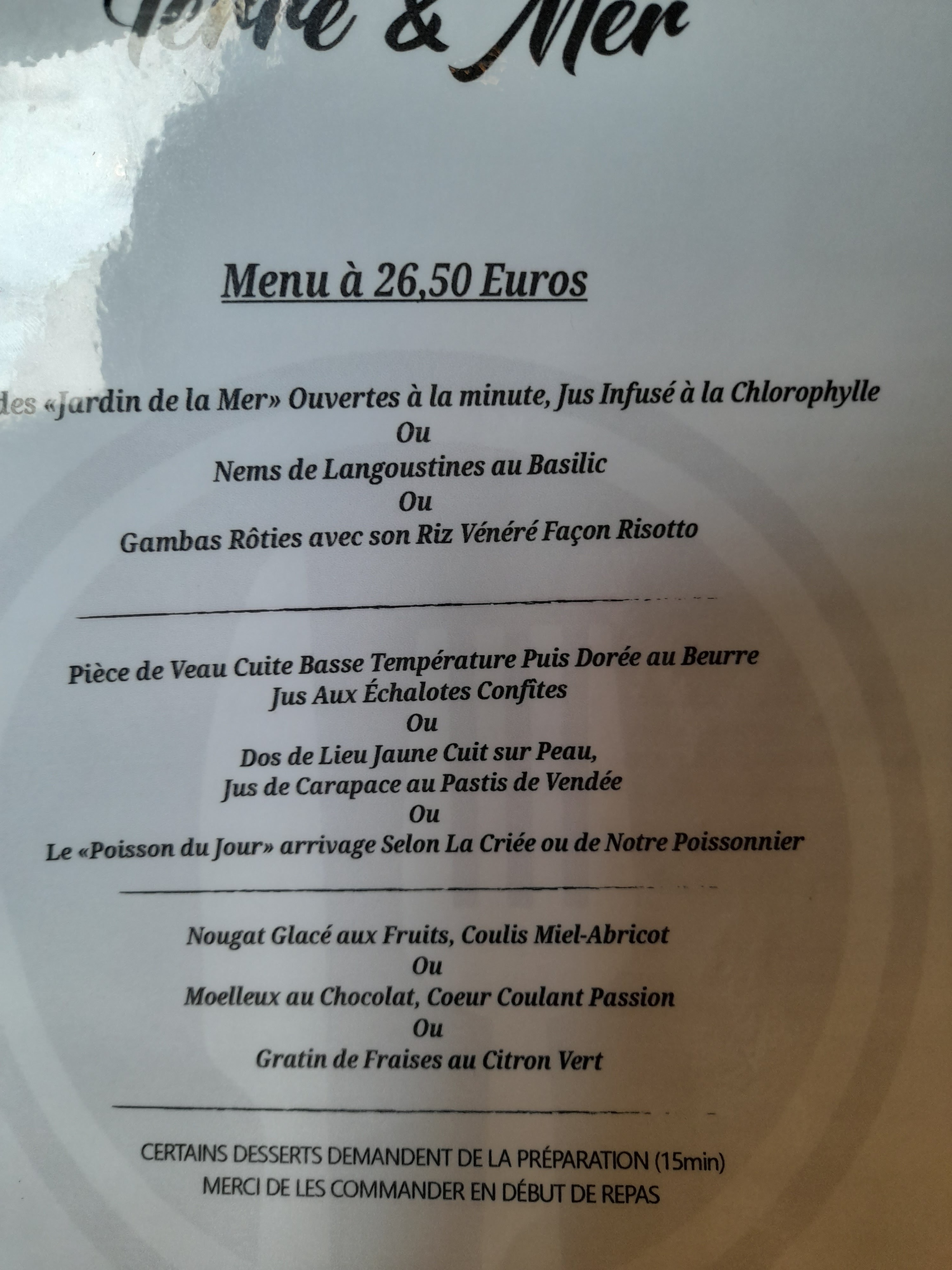 Rare restaurant ouvert le lundi à Noirmoutier. Nous sommes tombées sur celui-là et nous n'avons pas été déçues. Nous avons pris le nemu et les plats que nous avons choisis étaient dun raffinement et de belle présentation. La serveuse était très agréable et connaicait son métier. Félicitations au cuisinier. Je recommande vivement ce restaurant si vous passez par Noirmoutier.