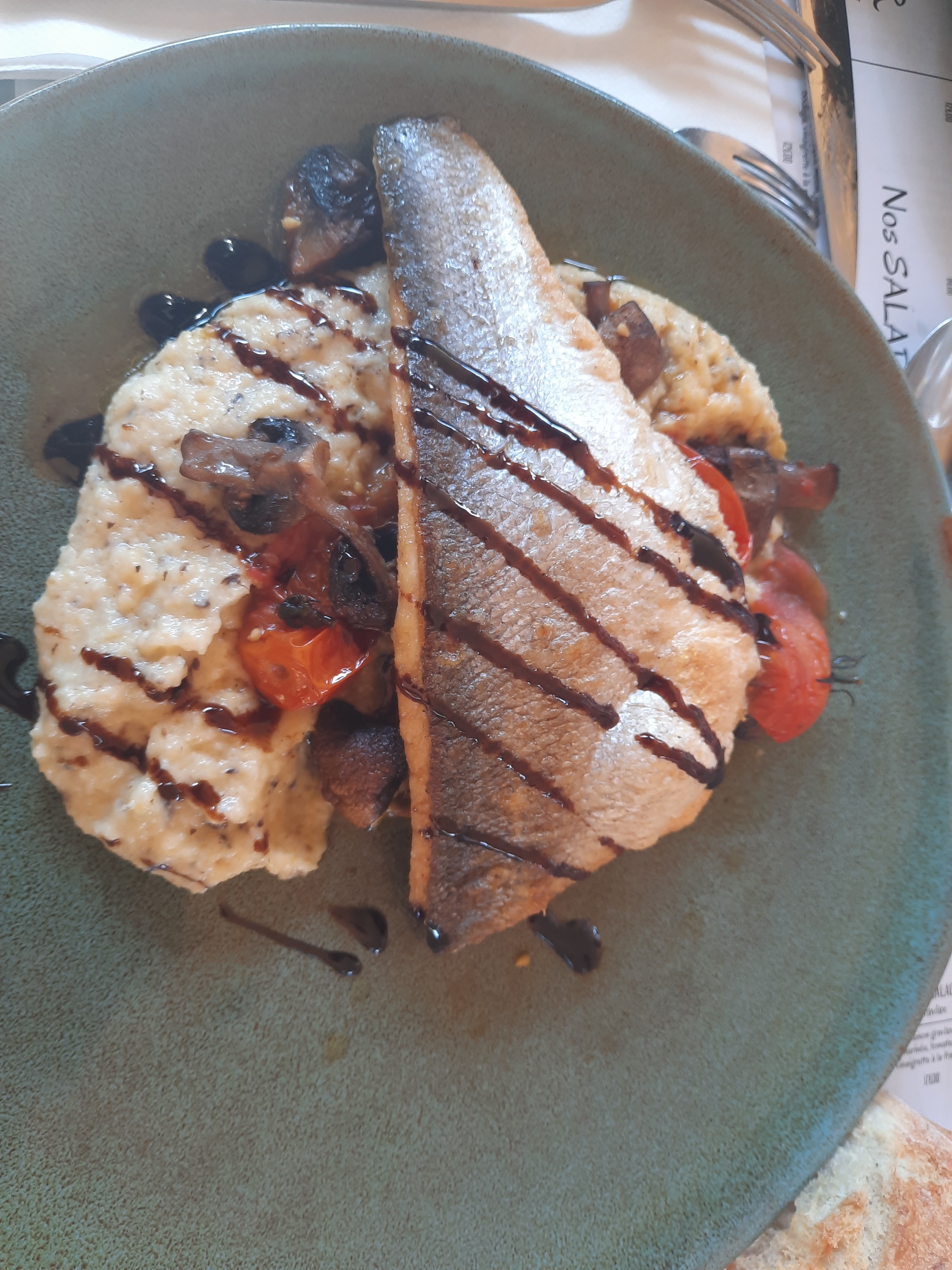 Déjeuner en terrasse cette semaine. Filet de loup aïoli avec ses légumes très sympathique. Mousse au chocolat généreuse et onctueuse. Très bon moment passé dans un cadre agréable.