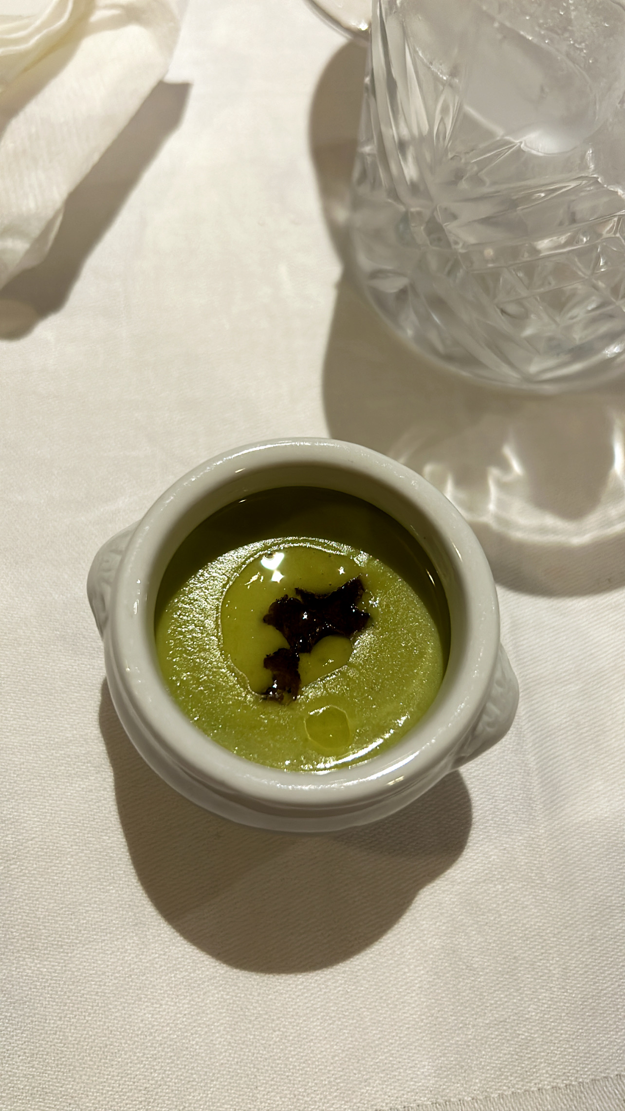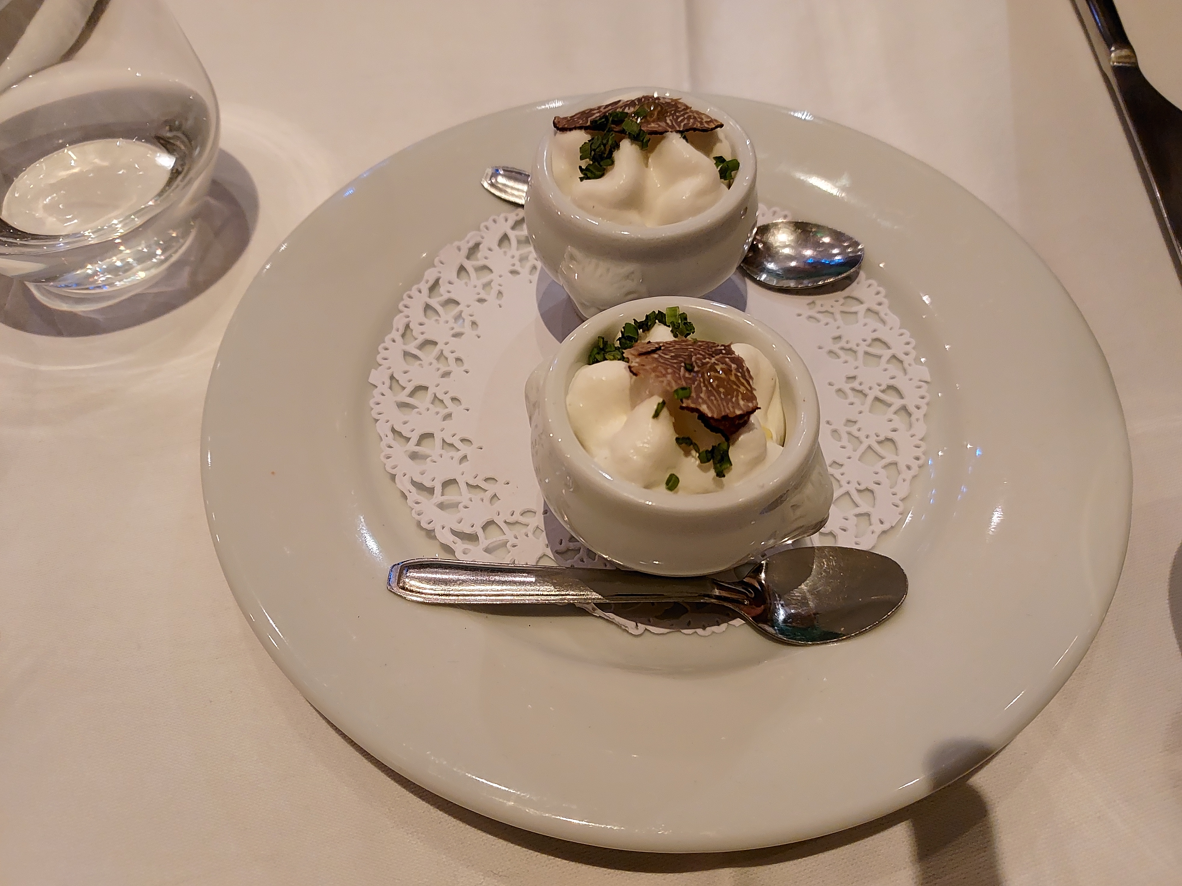 La nourriture était absolument extraordinaire! On peut dire qu'ils sont passés maîtres dans l'art de la truffe. La seule chose que nous n'avons pas appréciée, c'est que les serveurs étaient excessivement et visiblement insistants pour commander 3 plats complets et les champagnes les plus chers. Pour moi, ce n’est pas la classe que le restaurant essaie de représenter. S'il fait 30 degrés dehors, il est difficile de manger un repas à 3 plats, nous l'aurions fait si nous avions assez faim ! Mais nous n’aimions pas être obligés de payer plus à plusieurs reprises. Je le recommande aux amateurs de truffes !!