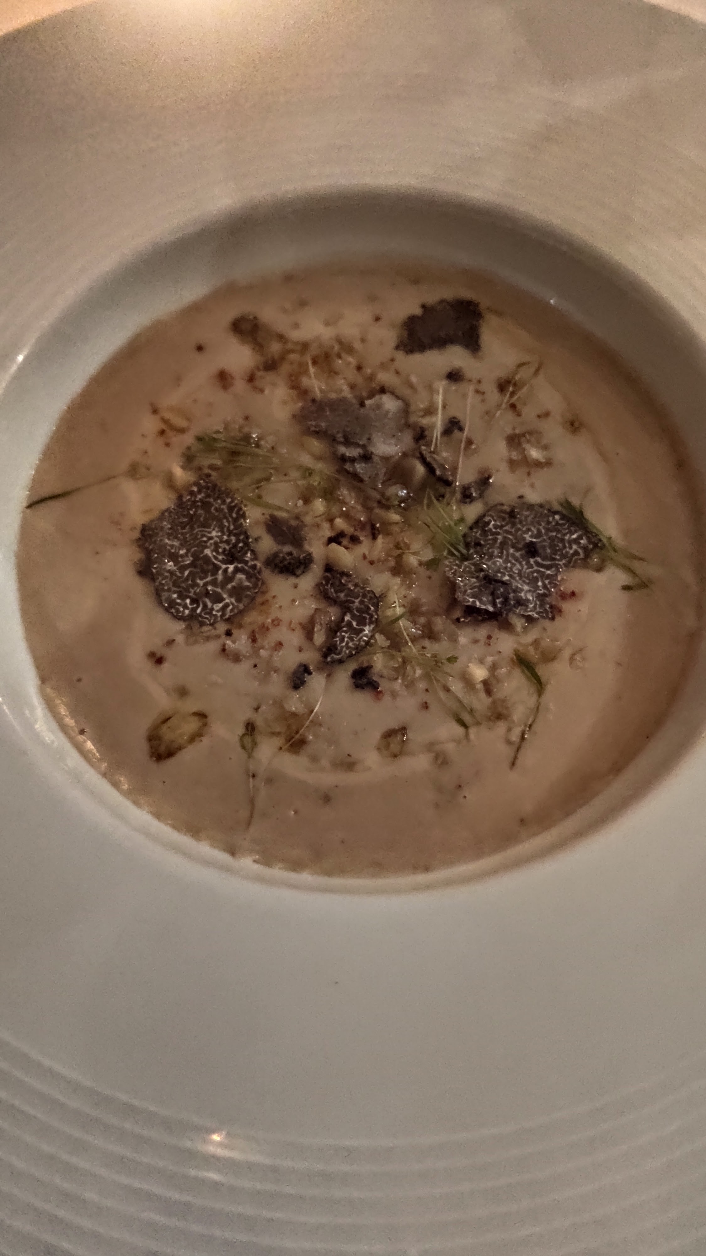 Ce restaurant est censé être un restaurant où tout est fait à base de truffes. En tant que passionné de truffes et cuisinier également avec des truffes, aucun des plats n'avait le goût de truffe. Raser des tranches de truffe sur chaque plat n'équivaut pas à un plat aromatisé à la truffe. J'ai ce restaurant sur ma liste depuis un certain temps et j'ai été très déçu en mangeant dans ce restaurant et surtout que c'était pour mon anniversaire. Le restaurant est petit et l'ambiance est très agréable et mon serveur était absolument génial mais la nourriture est médiocre si vous recherchez des plats aromatisés à la truffe. La nourriture est bonne mais si vous recherchez une saveur de truffe, vous ne la trouverez pas ici. J'aurais aimé pouvoir écrire une meilleure critique mais j'ai été très déçu et surtout pour le prix.