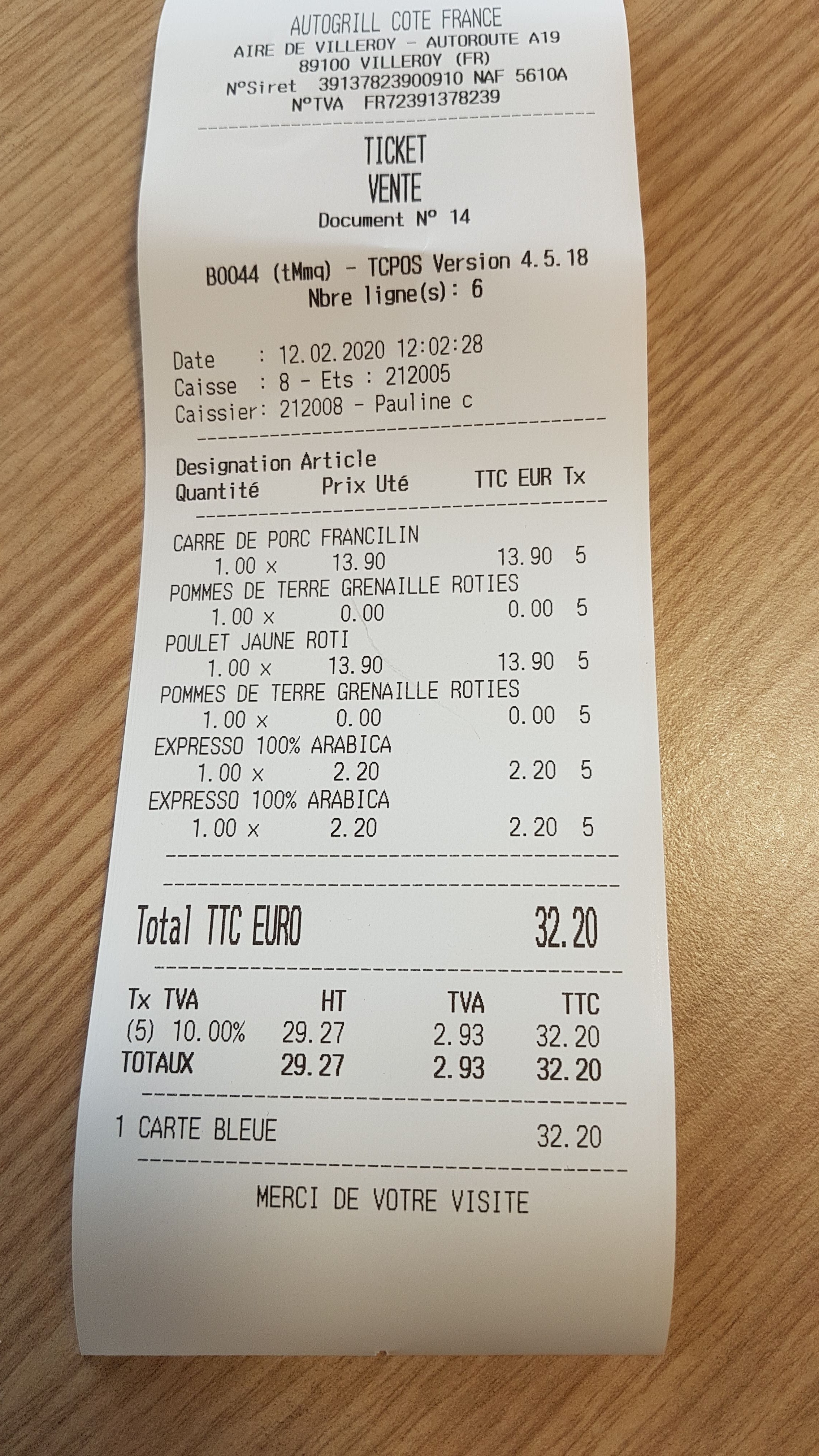 Le prix est trop cher 12€ pour une part de lasagne quasiment pas de viande dedans, 7,30€ pour 2 fromages, une mousse au chocolat à 3,50 € et un coca à 3,50 € un morceau de pain à 0,90€ pour un total de 28,10 €. Voilà pourquoi je mange très rarement dans les restaurants d'aires d'autoroute...