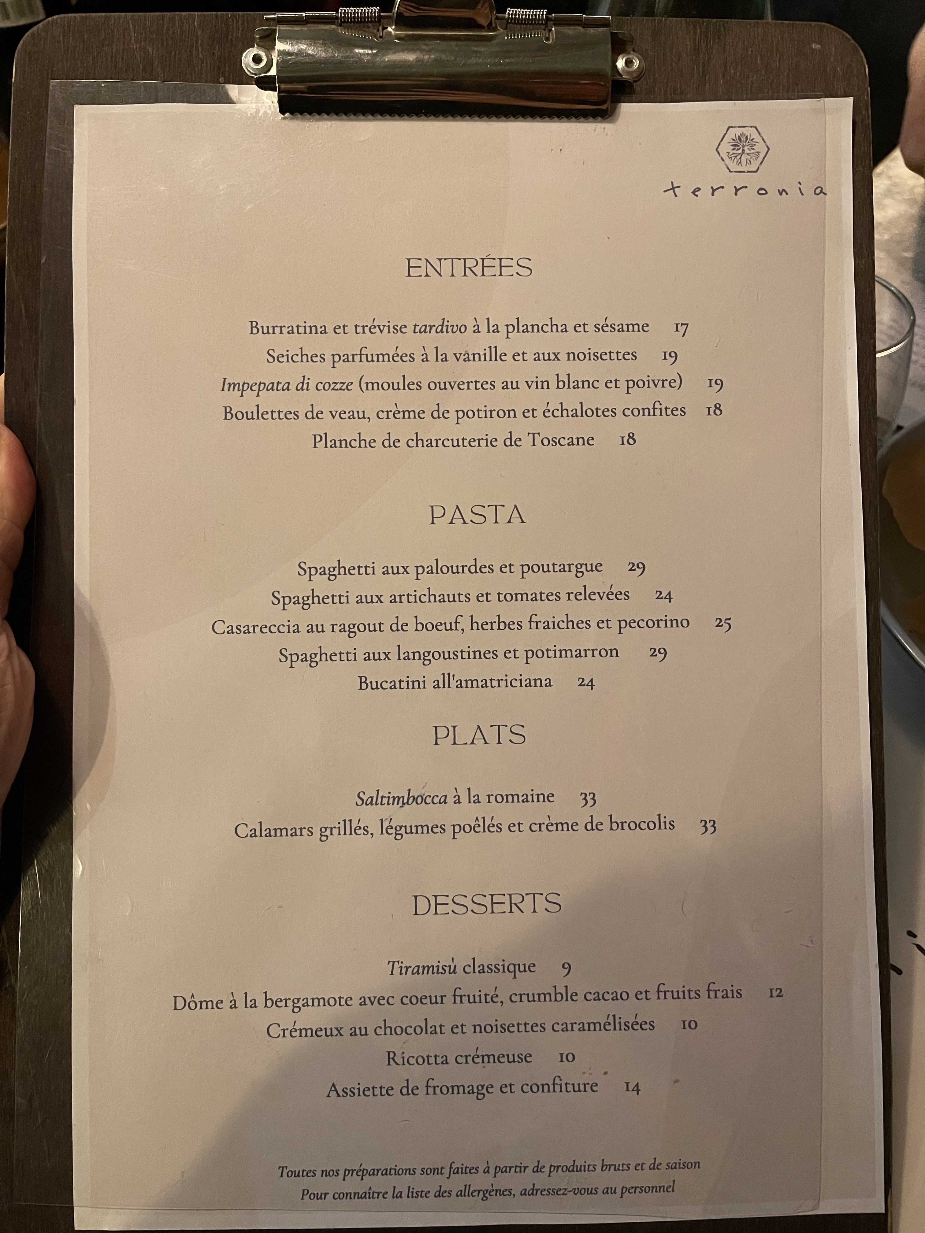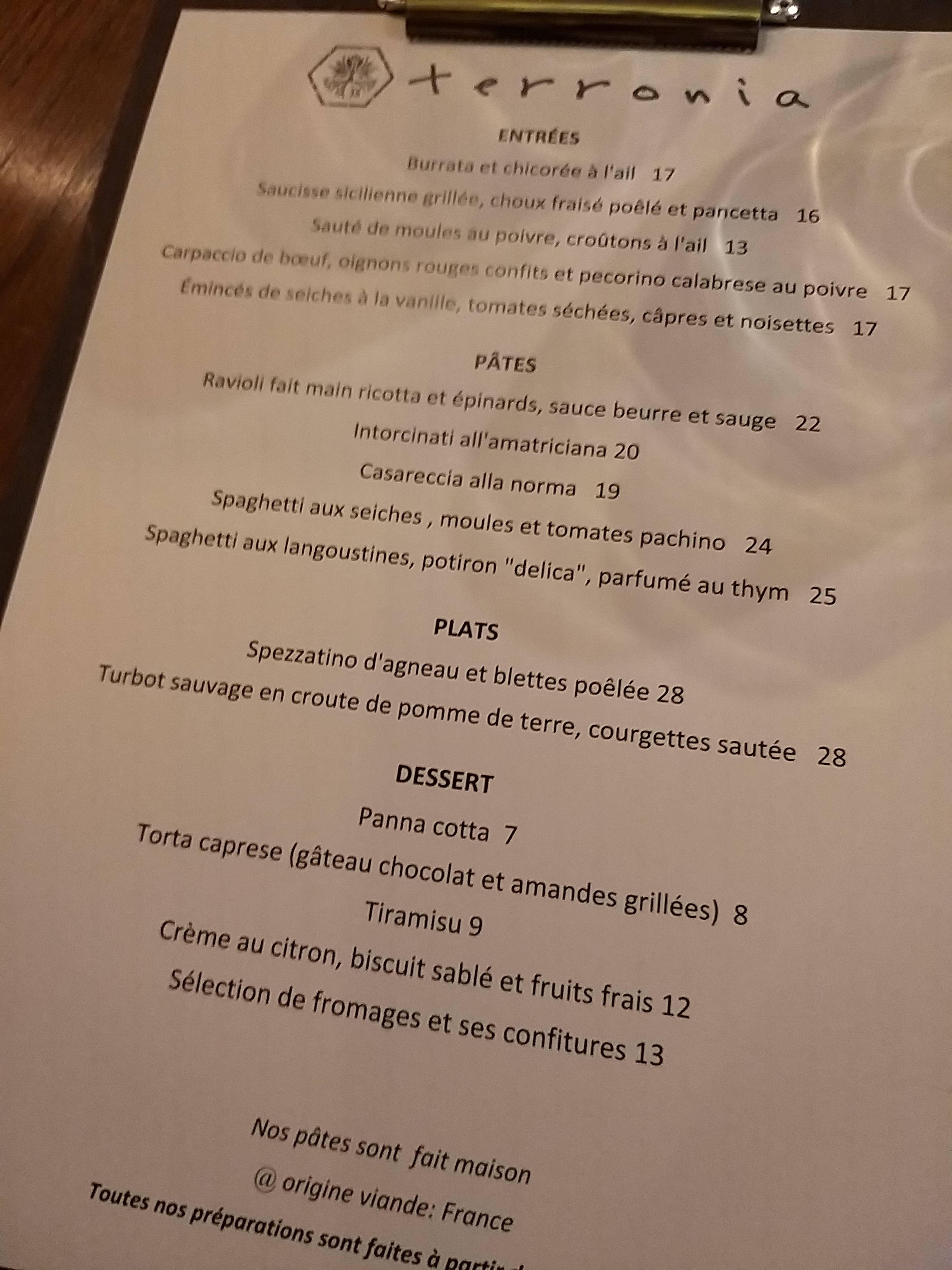 C'est la deuxième fois que nous venons dîner au Terronia et cette fois encore nous avons passé un bon moment. Les plats de pâtes que nous avons goûté étaient délicieux, les desserts étaient très bons également. Les quantités sont suffisantes et dressage est très soigné. Le vin de Toscane etait très bon lui aussi. Enfin le service est discret tout en etant attentionné et le chef est très sympathique.