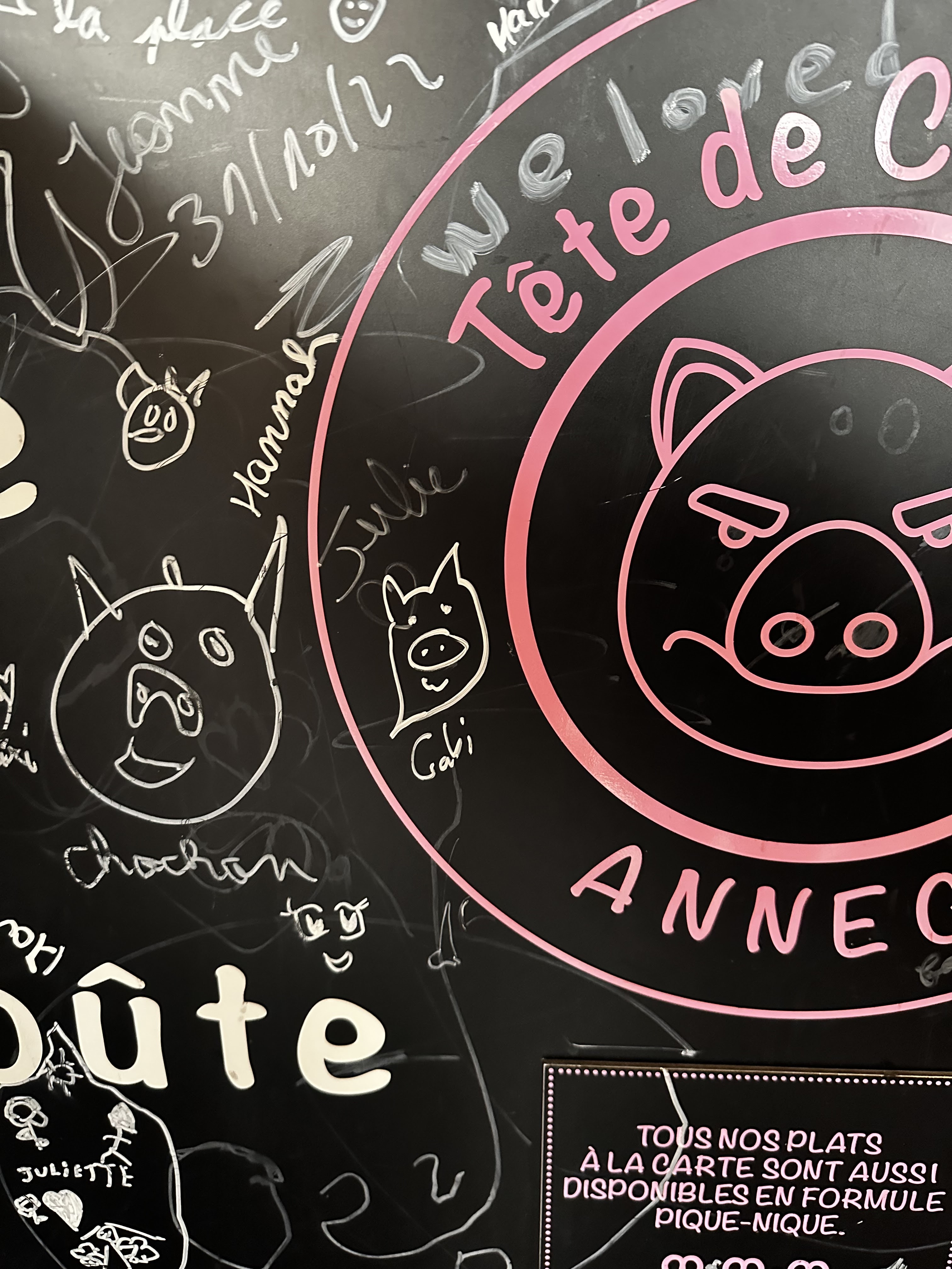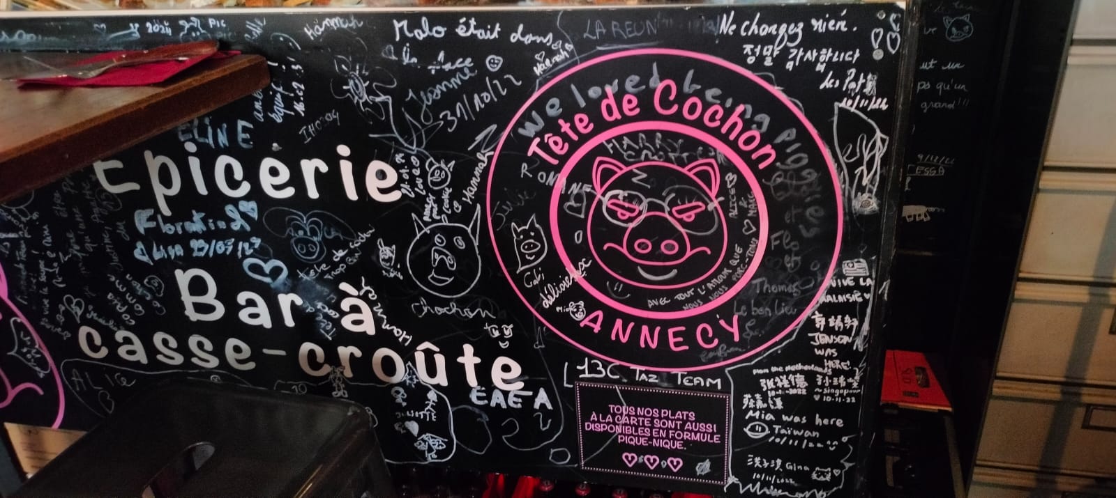 Nous sommes arrivé Le 17 février 2024 à Annecy à l'hôtel du château hôtel très bien situé plein de charme et d'un accueil comme j'aime chaleureux, ils nous ont conseillé des restaurants mais tous complet et finalement le hasard fait bien les choses car je suis tombé sur le restaurant tête de cochon et des mon coup de téléphone j'ai eu un feeling avec l'une des serveuses d'une gentillesse et d'un humour communicatif , nous sommes arrivé dans se petit cocon , avec une cuisine simple mais tellement bonne tout était parfait petite musique en bruit de fond on était si bien . Je recommande vivement cette établissement 😀 Et mille merci pour se moment