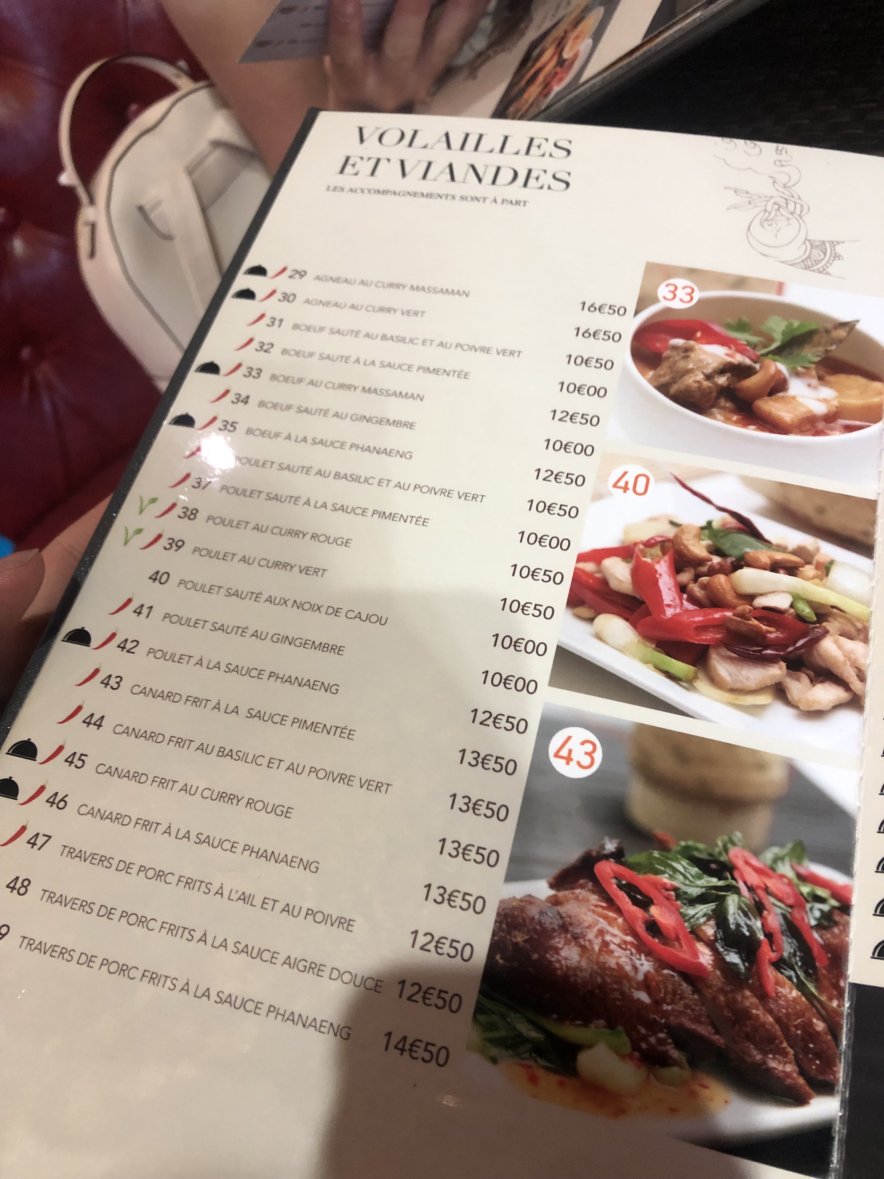 Très bon resto thaï, dommage que seul le poulet est halal. Le menu à 30€ est excellent qui comprend un cocktail maison, une entrée parmi un choix proposés, idem pour le plat et ses accompagnement et un dessert parmi un choix de 3 aussi Carte très variées poulet boeuf crevettes canard etc...
