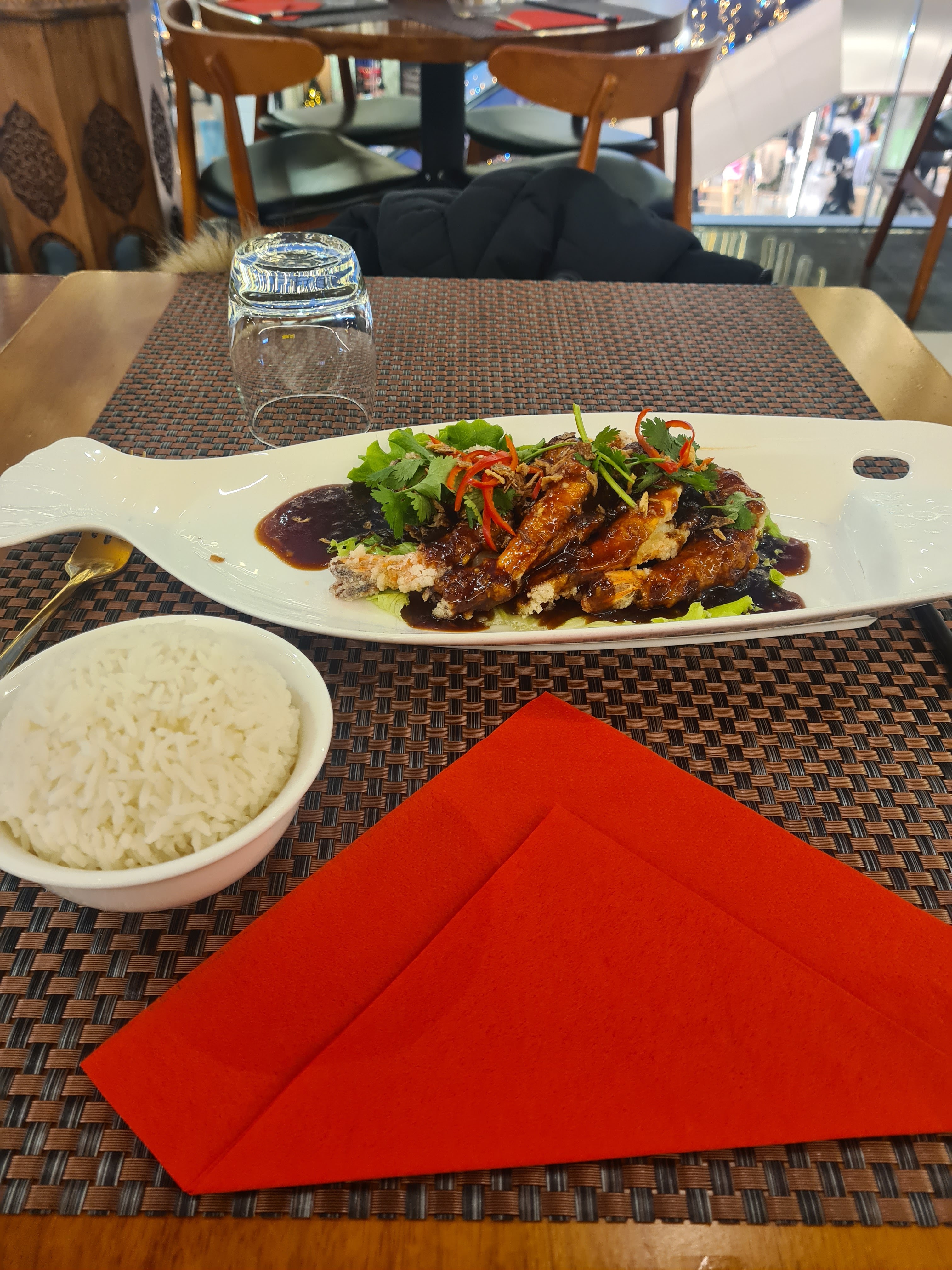 Le restaurant est magnifique et propre, le service impeccable et équipé d'un robot. Les plats sont bons Le poulet est hallal.