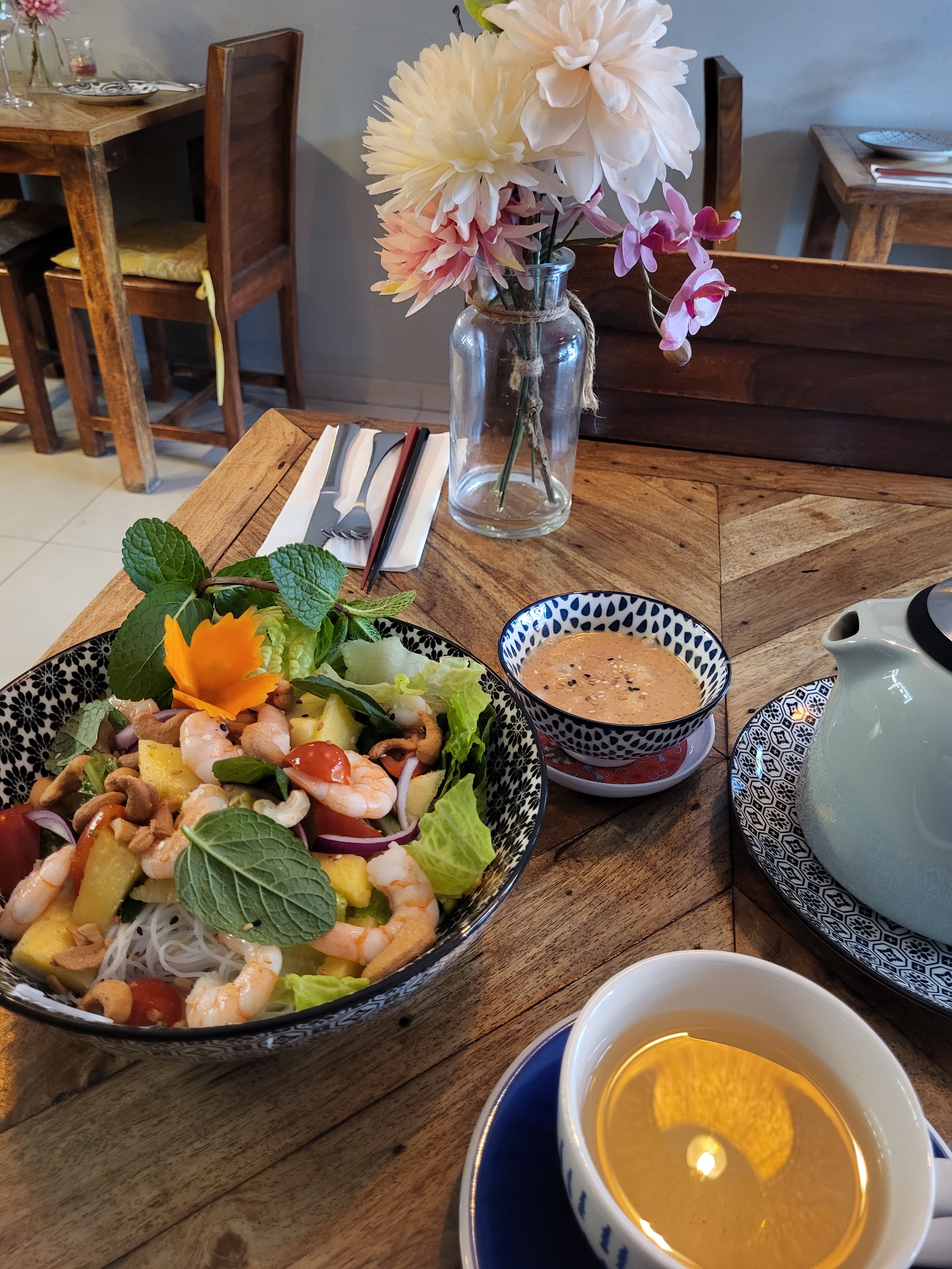 Petit resto très sympathique à l’image de sa propriétaire . Deco et musique zen . Pour ma part j’ai pris un curry de poulet qui était délicieux, relevé juste comme il faut 👌. On y retournera 😊