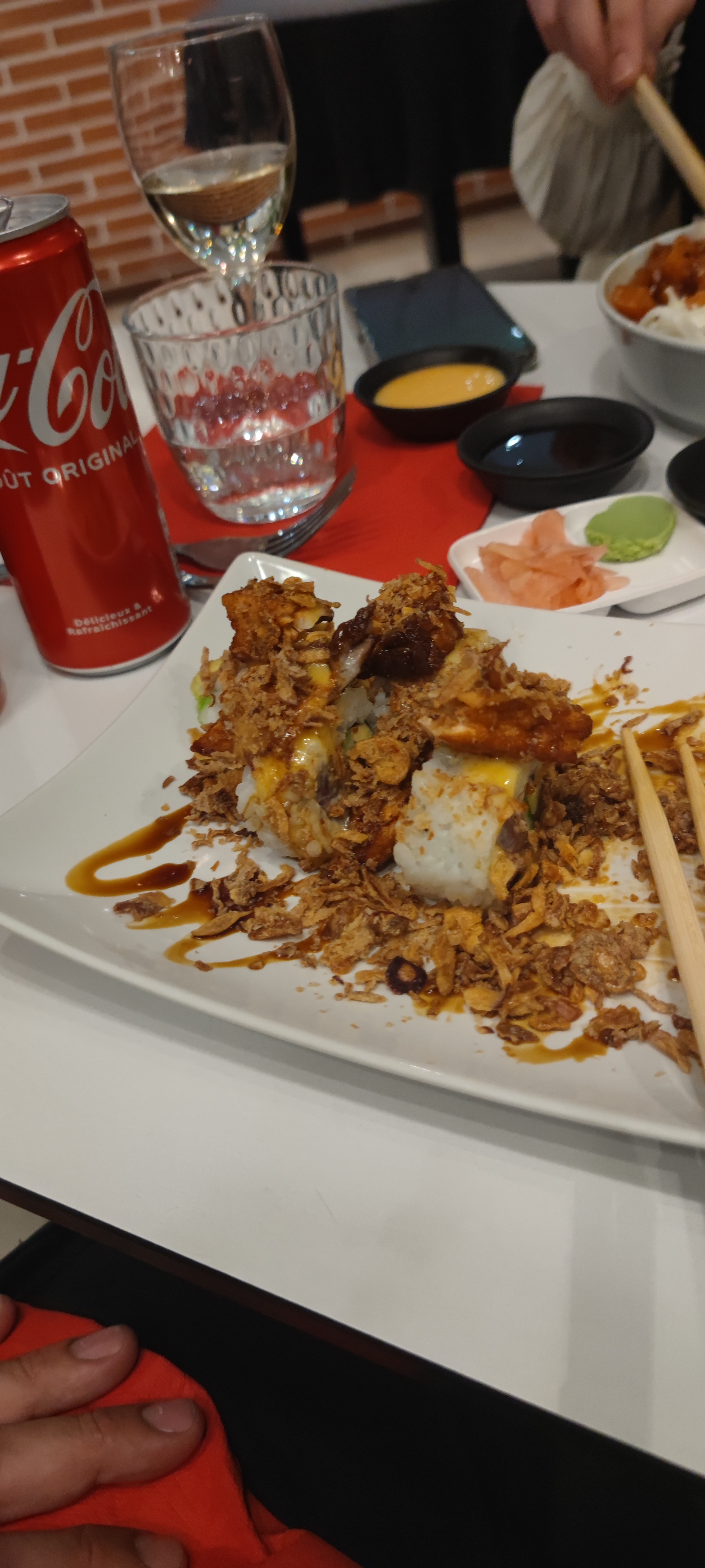 Positif : Sushis nickel ! 👍propres et rien à signaler au niveau du goût Accueil au comptoir agréable et serviable A revoir : Les nems sont fait avec la feuille de brique des samoussa et pas une feuille de riz translucide, je n’ai pas apprécié la recette dedans, peut être mes goûts 🤔 La pâte des beignets pour moi n’est pas optimale en terme de texture…