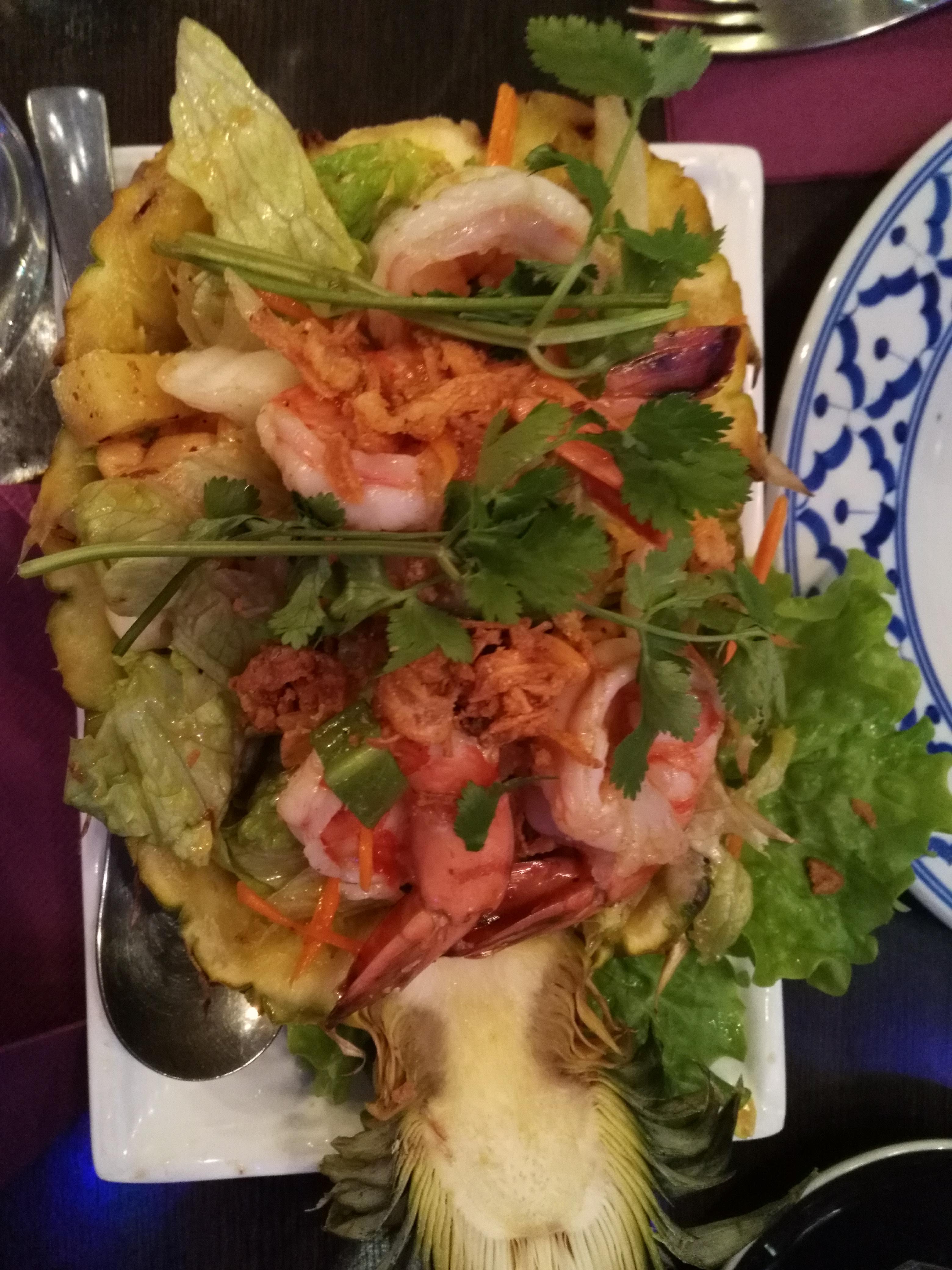 Très très bon thaï pas chère , service rapide 18euros un menu entrée plat dessert le soir c’est de moins en moins courant . la salade de crevette dans l’ananas est très bonne .