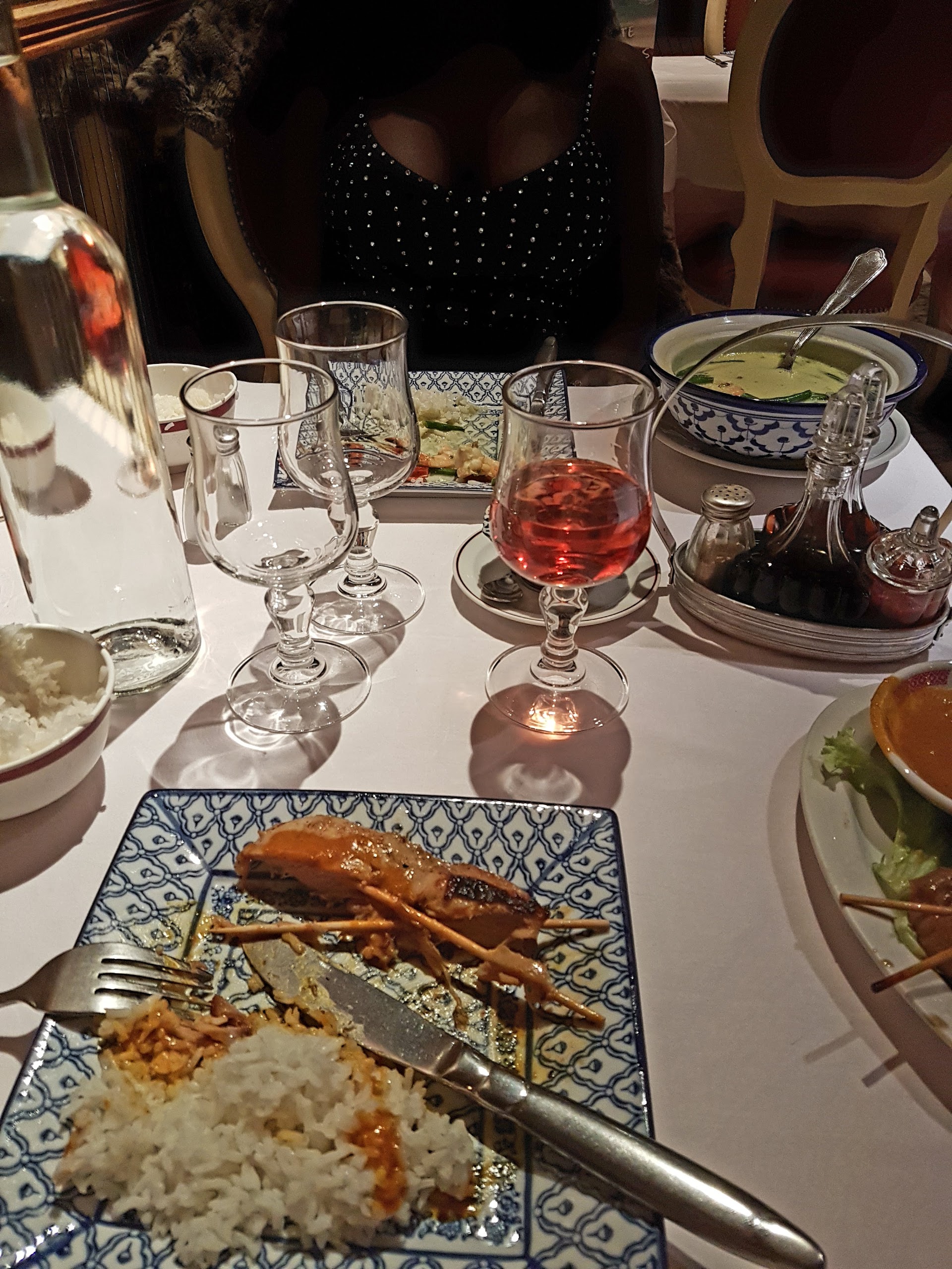 C'est la première fois que je me rendais dans ce restaurant thaï et je n'ai pas été déçue. Une déco un particulière...mais bon. J'ai pris le menu à 18€. J'ai notamment pris des nems en entrée, qui étaient servis avec une sauce adaptée, et des brochettes de poulet servis avec une sauce à base de cacahuètes et j'ai choisi du riz cantonais en accompagnement. C'était excellent ! Tout était bon et la sauce cacahuètes faisait un peu sucré salé. Délicieux. La responsable était un peu désagréable cela dit. Elle devrait faire plus attention à sa façon de parler qui est quelque peu agressive.