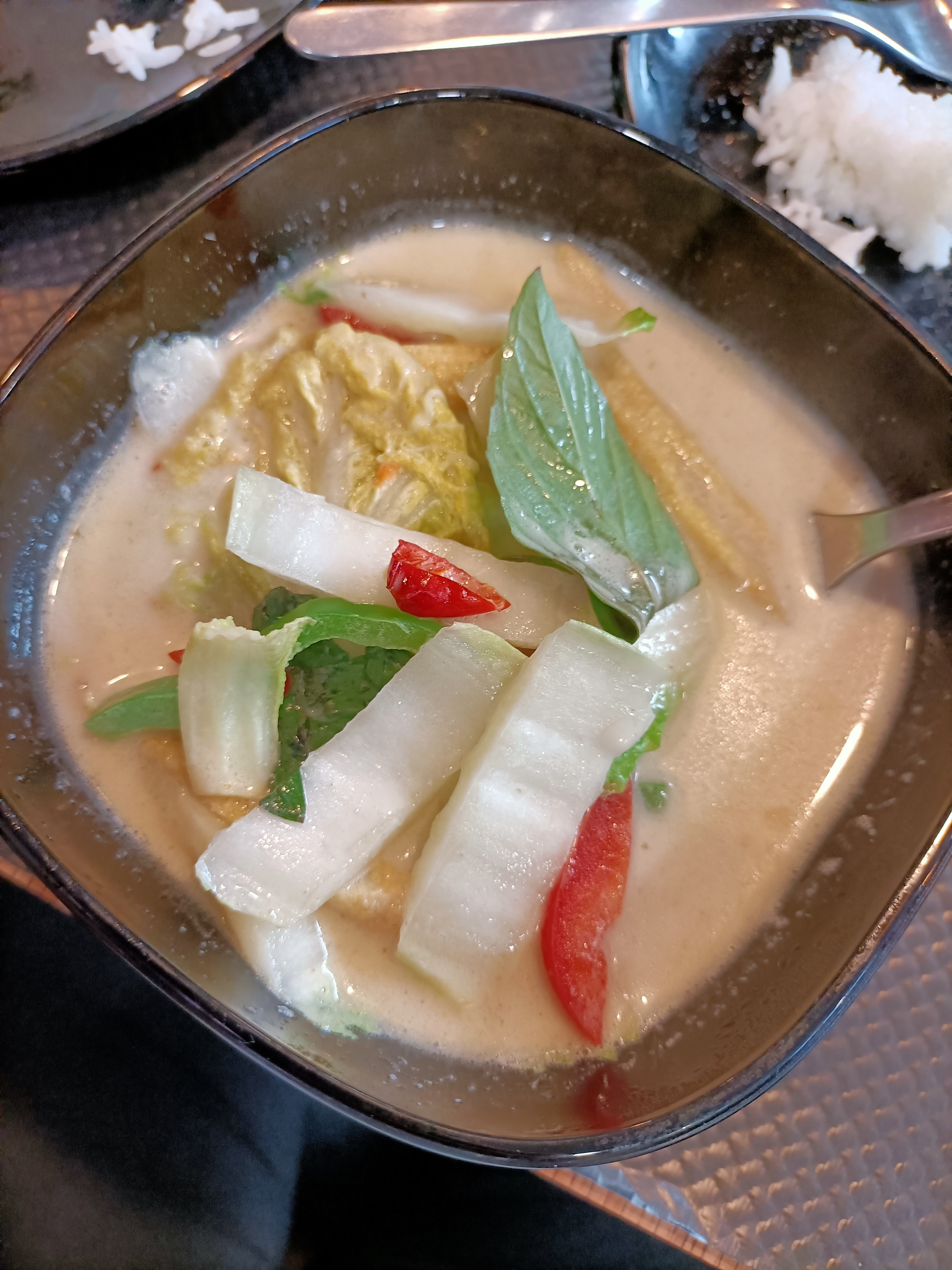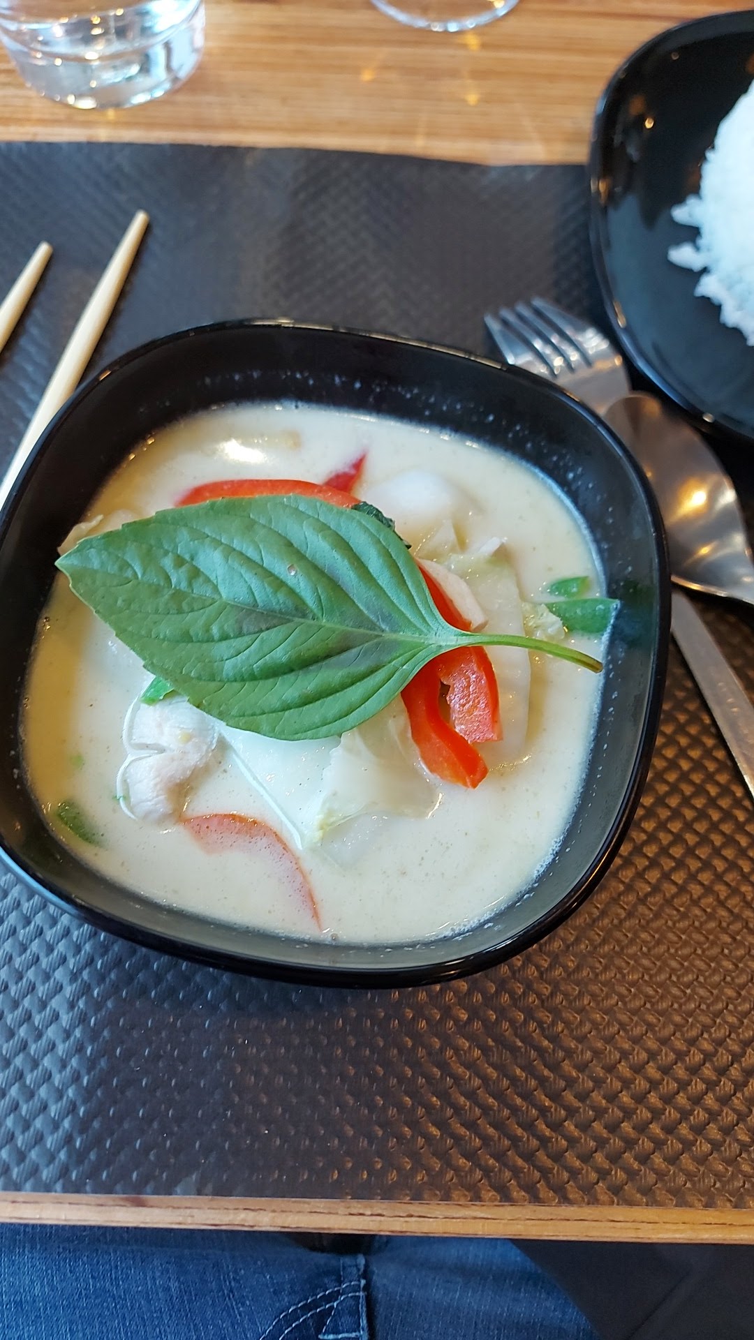 Petit restaurant cosy. Une cuisine avec de bonnes saveurs thai et pour un tarif raisonnable surtout si l'on prend le plat du jour. Le service aussi est agréable. Attention à la porte d'entrée automatique. Il suffit de passer sa main devant le capteur sans le toucher pour l'ouvrir. Hygiéniquement c'est top mais n'ayant pas l'habitude de ce système je crois qu'on est nombreux à se faire avoir et à forcer un peu la porte 😅.