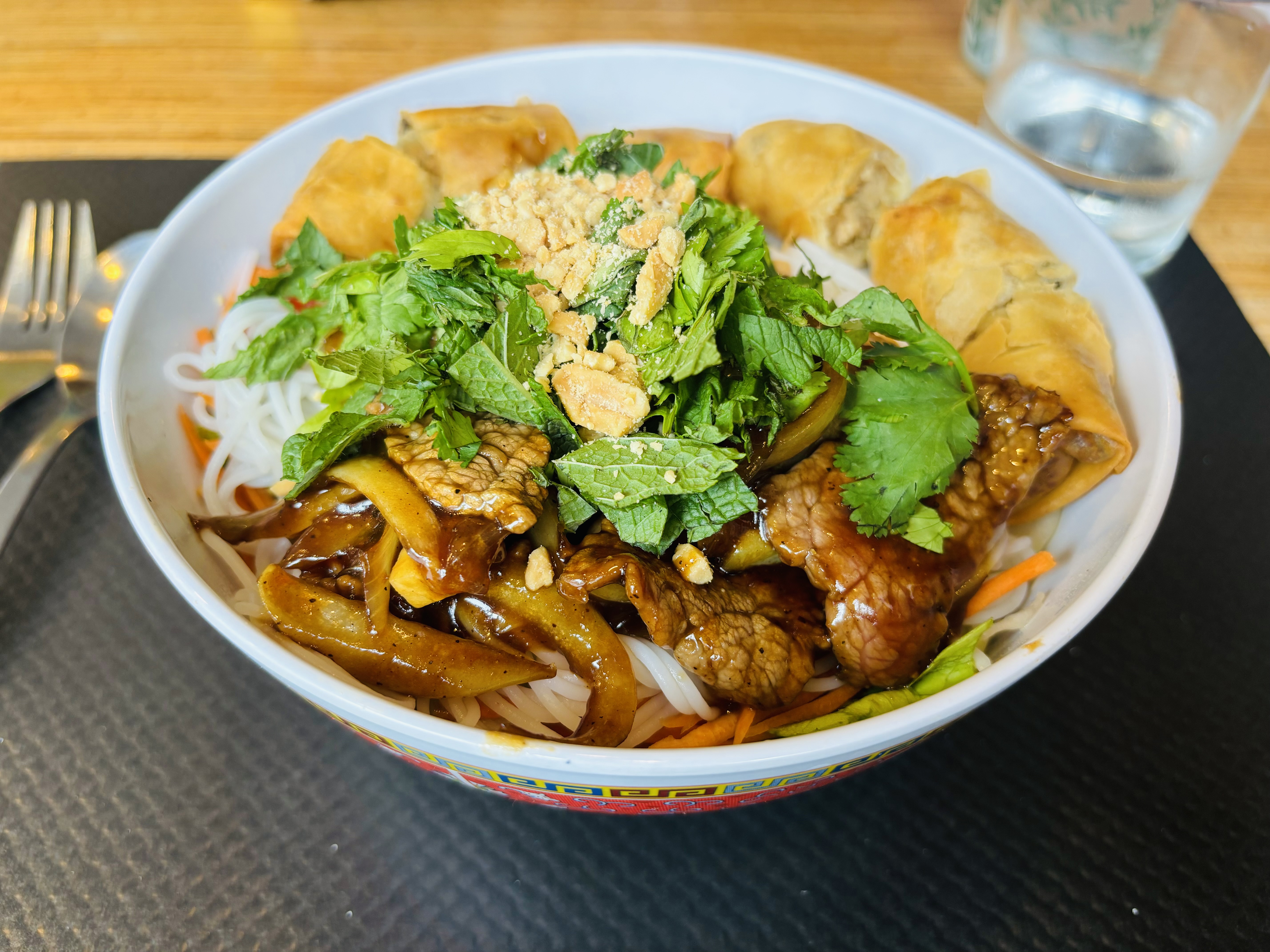 Je n’ai pas eu le temps de prendre mon assiette en photo tellement c’était bon, alors je me peter de prendre les contenants de ma salade bo bun à emporter pour continuer de me régaler le soir, car je trouve les indications très pertinentes et bien pensées! Nous nous sommes régalés…pour ma part ce fut un pad taï poulet et des nems, partagés avec ma moitié 🥰. C’était vraiment succulent! Le propriétaire et la serveuse sont aux petits soins tout au long du repas, soucieux de savoir si leur clientèle est comblée du début à la fin. Nous y retournerons certes et nous le recommanderons à notre entourage!