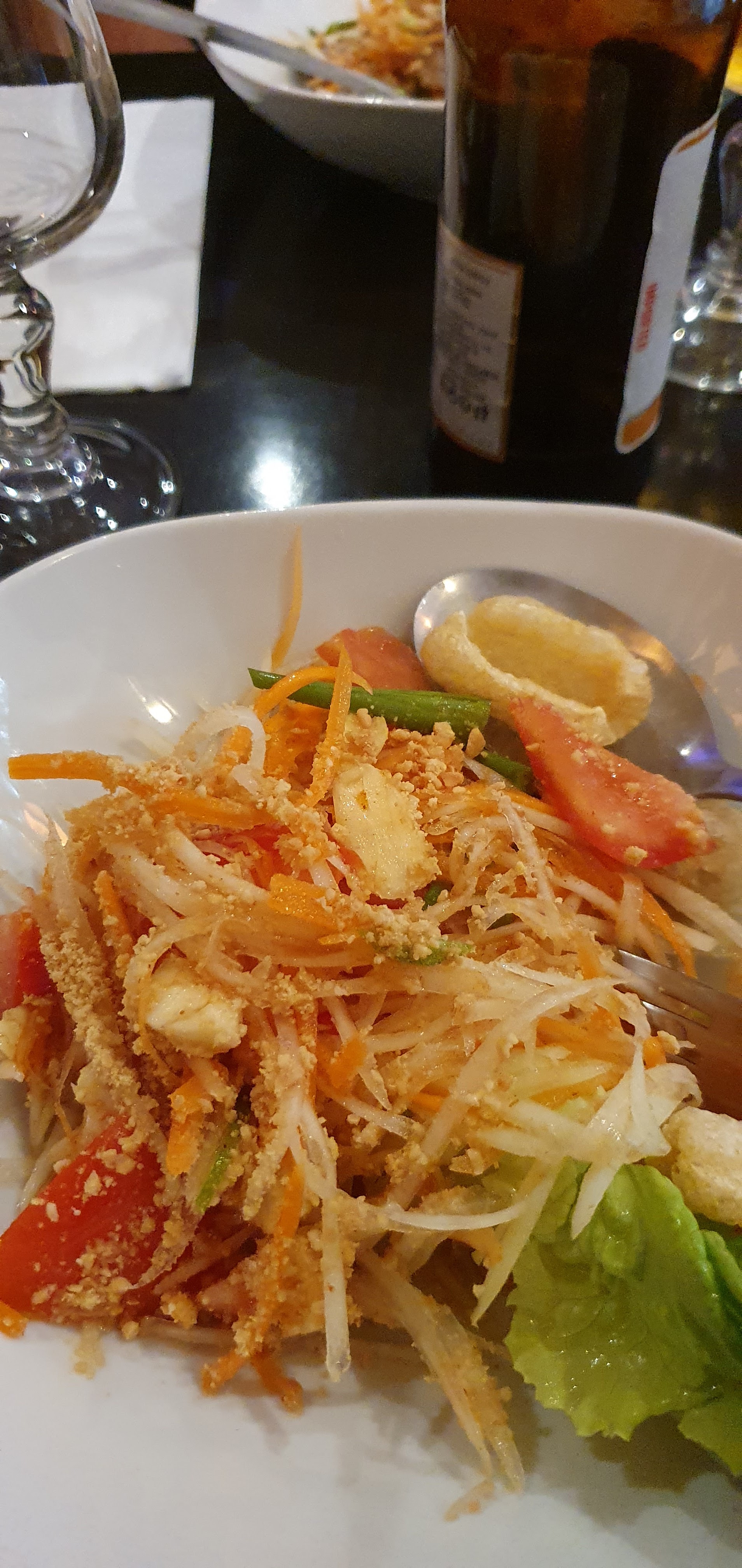 Bonjour cela faisait un moment que je n'étais pas venue : cuisine familiale thaï : bonnes brochettes au porc, riz gluant ou poulet au basilic Ceux qui m'accompagnaient ont bien aimé même ma fille ado. News au poulet croquants avec salade fraîche et feuilles de menthe Acceuillant et convivial Bien cordialement