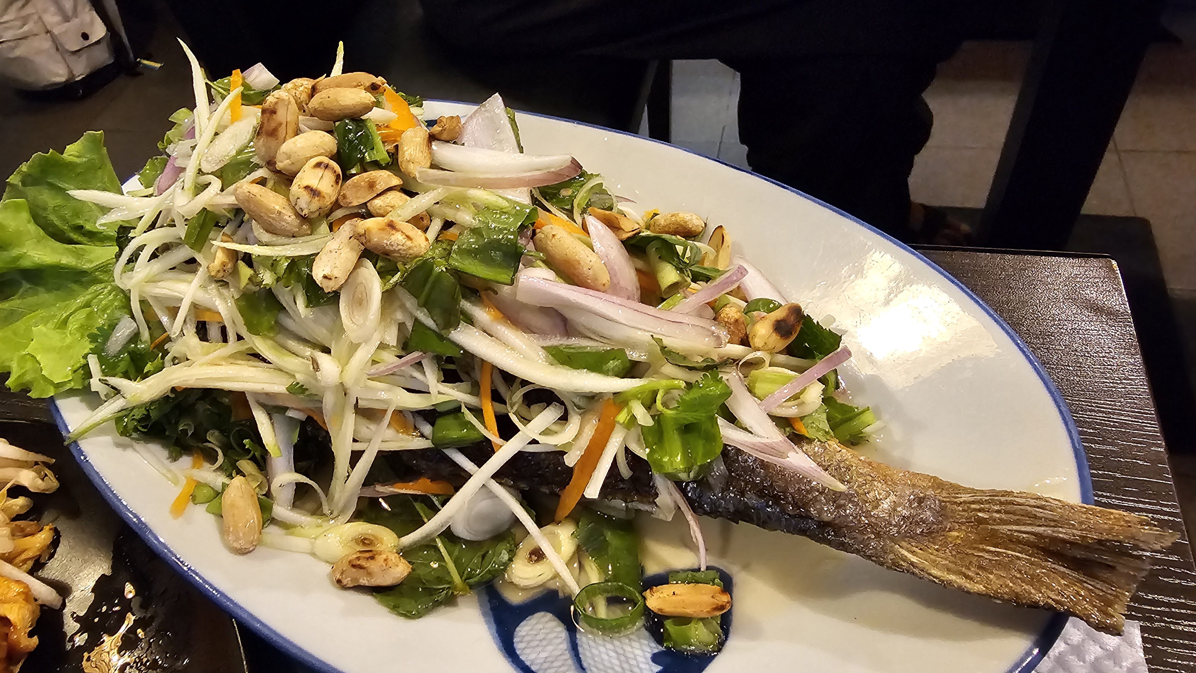 Salade de riz croustillant, l'une des meilleures que j'ai eu l'occasion de manger, pourtant je l'ai essayé souvent et à bcp d'endroit. Quand au poisson frit a la papaye un régal. Très bon moment