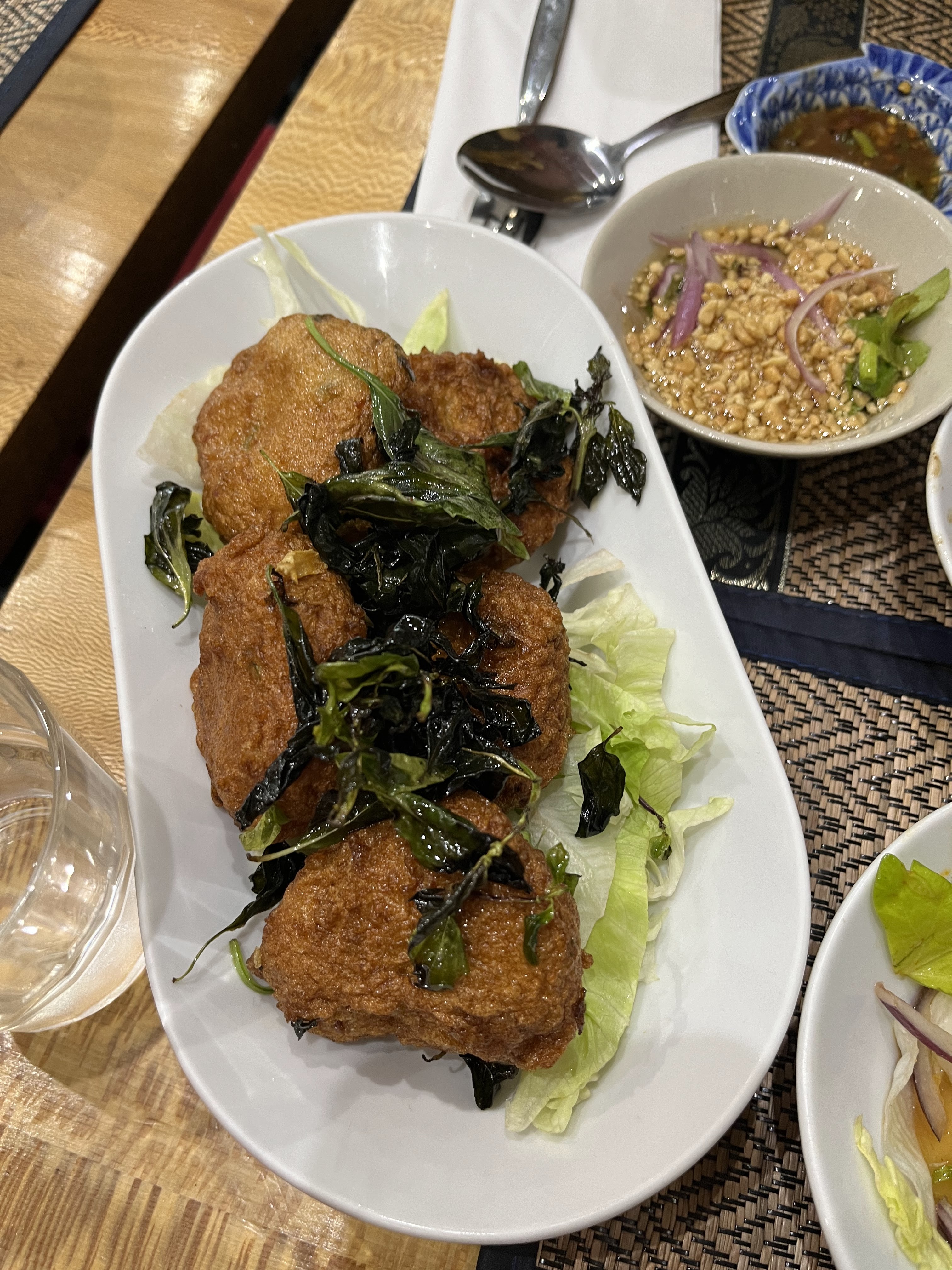 C'était super bon Un de mes meilleurs restos thaï On a goûté des galettes de poisson, une salade de riz croustillant que j'ai adorée, des crevettes à l'ail et au poivre et un pad Thai Service très sympathique