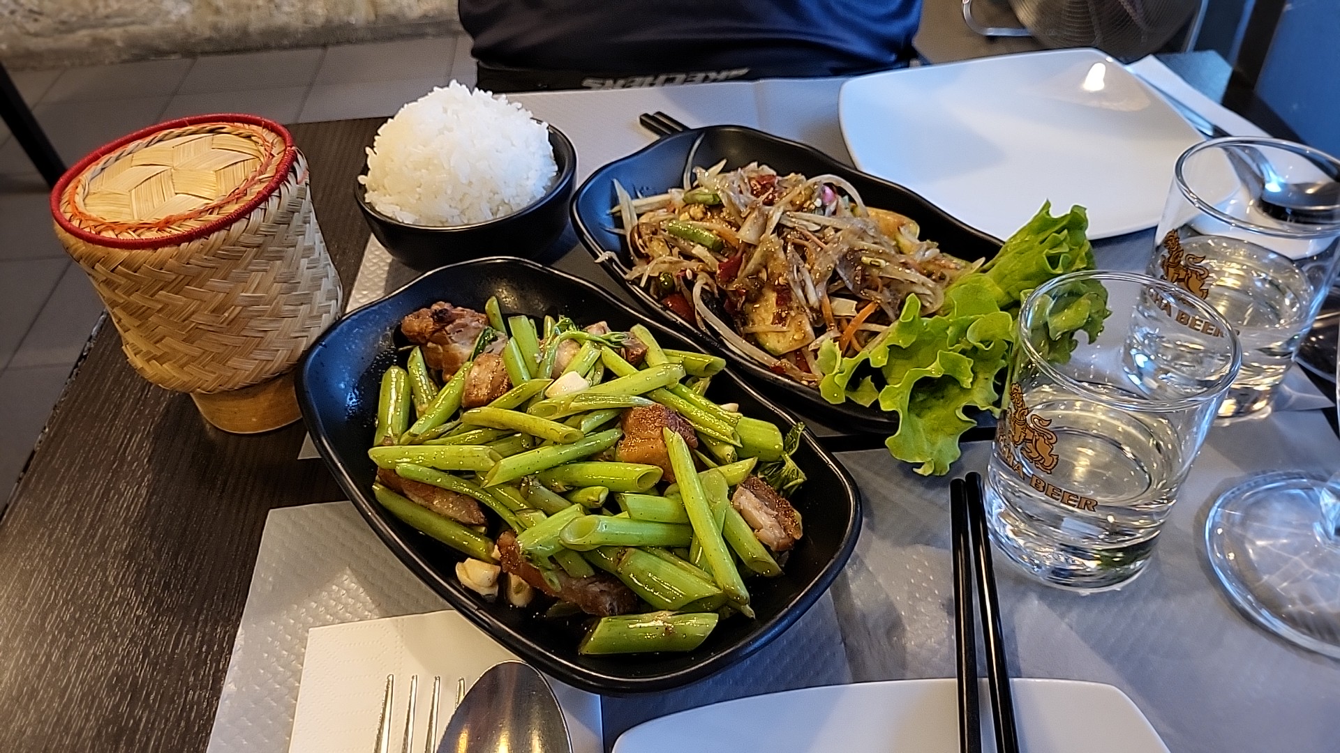 Je suis tombé sur ce restaurant thaïlandais pas hasard et je ne regrette pas du tout ! Je galère toujours à trouver des restaurants thaïlandais qui proposent des liserons d’eau quand ils en proposent je sais que c’est bon signe. J’ai pris les liserons d’eau avec porc croustillant avec riz gluant et mon ami curry vert avec boeuf et riz gluant. Un peu chère par rapport aux quantités servis j’avais encore faim mais c’était vraiment très bon je recommande ce petit restaurant. Les serveuses étaient très gentille également.