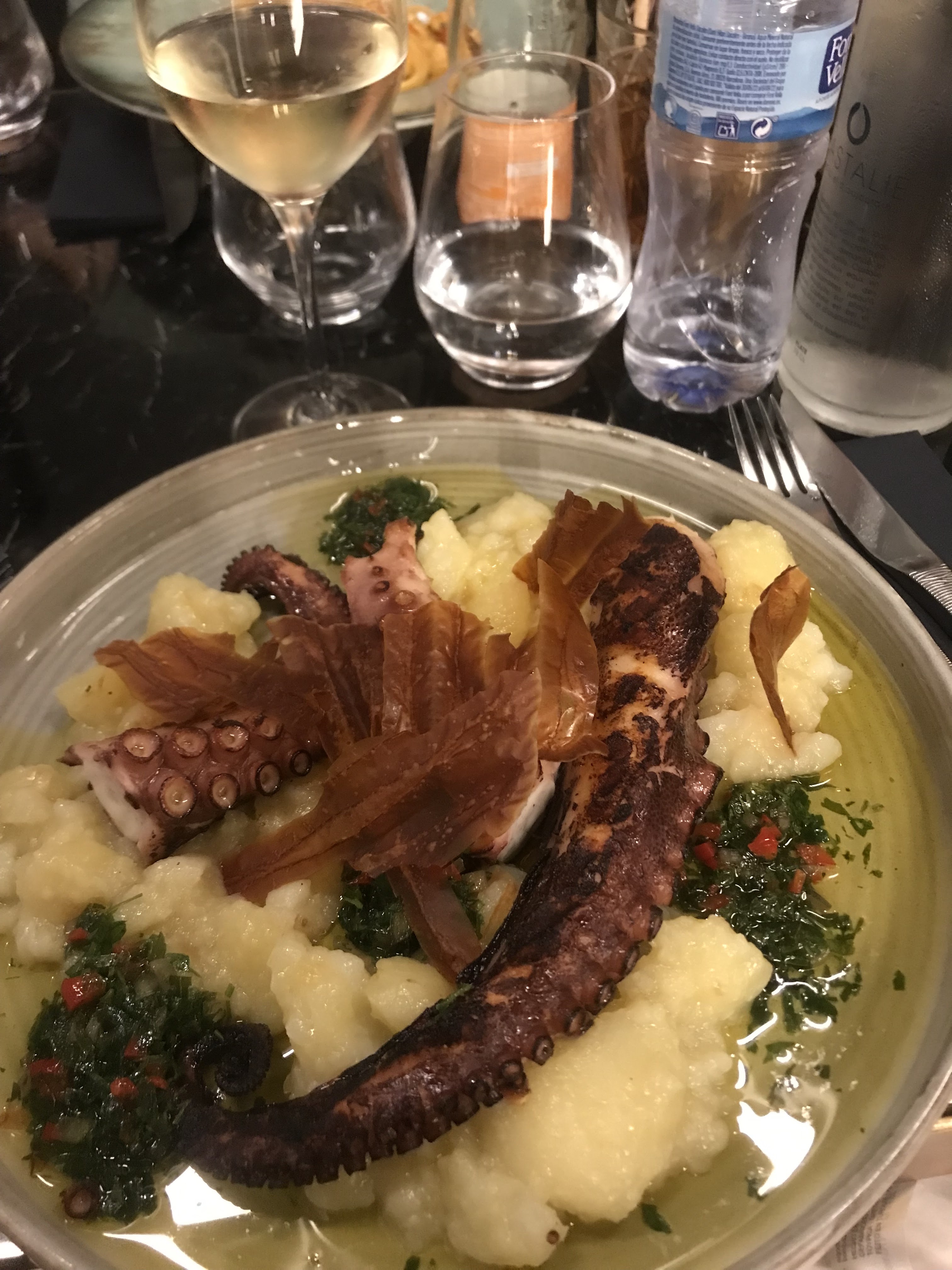Étonné par tous ces avis très positifs, le serveur nous a expliqué, sans rire, que les calamars annoncés dans les linguine à l'encre de seiche et calamars étaient fondus dans la sauce et que les deux petites lamelles étaient là pour faire beau. Et pour achever le tout, le plat était froid. 43 ans que j'ai un restaurant à Lyon, il faudra que que je reprenne le concept du fondu dans la sauce. But that's life.