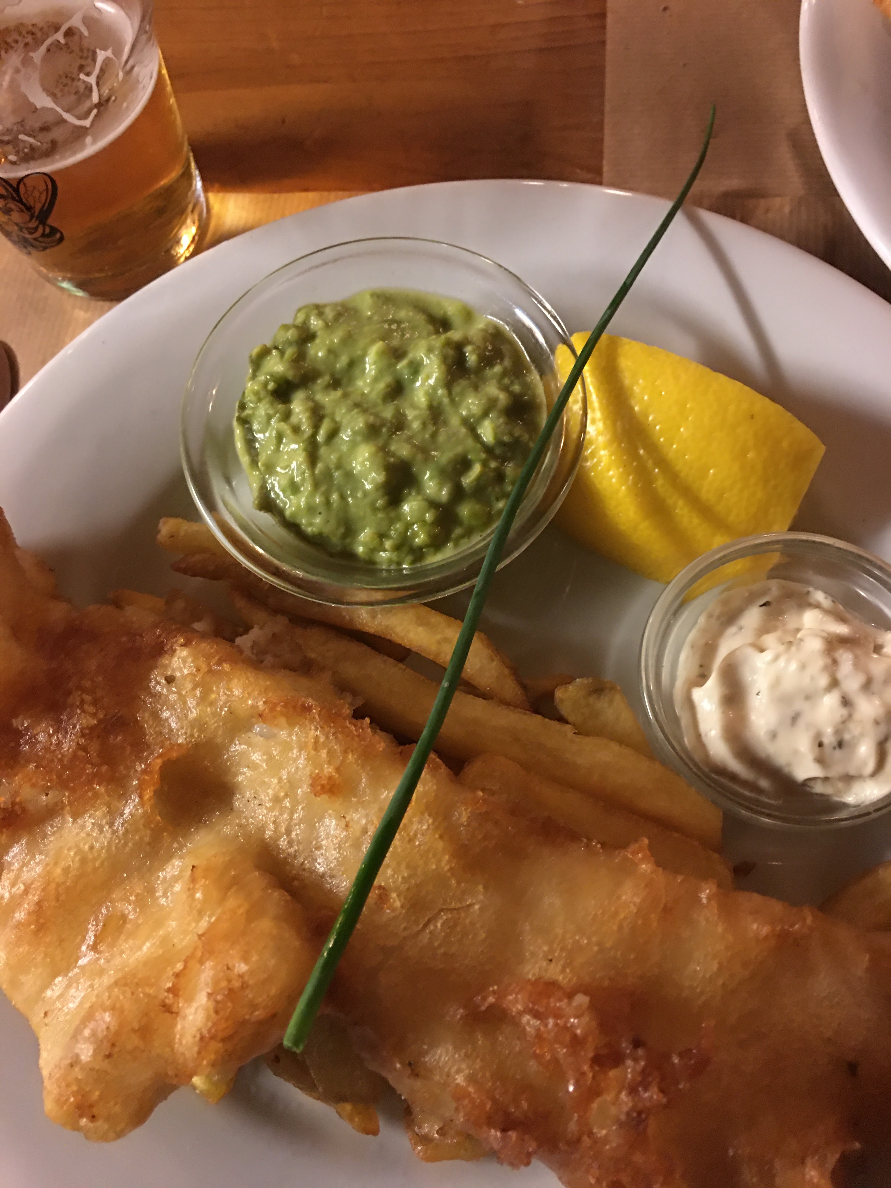 Comme en angleterre! Le plus: la purée de petits pois. Très bon fish&chips