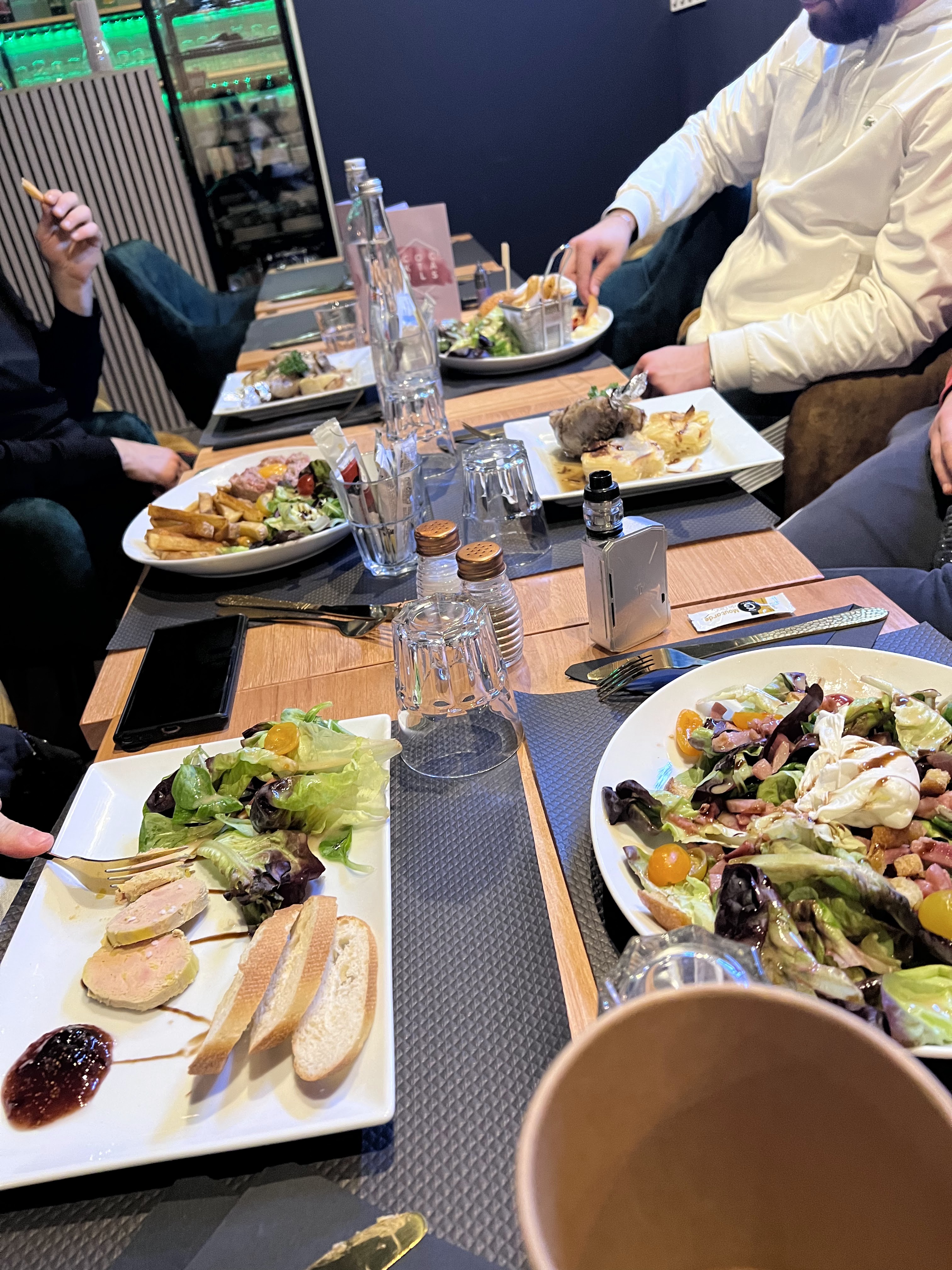 Très déçus, Nous sommes venus grâce à la vidéo de @Facebouffhalal qui nous avait donner bien envie. Nous sommes arrivés à l’heure de 21h30 , avons pris nos commandes assez rapidement, et nous avons attendu près de 1h45 pour être servi, Nous avons pris 2 coktails qui étaient pratiquement que de l’eau, En entrée nous avons pris tartare de saumon, que nous n’avons jamais eu et réclamer pour à 2 reprises au serveur, L’assiette burrata et charcuterie par contre était excellente, nous attendions la suite avec impatience, puis 1h30 plus tard, nos plats, Souris d’agneau, Et pâtes aux gorgonzola et entrecôte, et la, catastrophe. Vraiment, la viande de mon mari était pleine de gras, Frites encore congelé mais cuite, Goût cartonneux, Et surtout pas de pâtes et un plat différent arrive, Mais nous avons fait rapidement l’échange, Les serveurs sont réactifs, La souris d’agneau, était vraiment pas tres bonne, arrière goût de viande avarié… Pas de dessert pour nous, Nous sommes parti juste après être servi et avoir goûté .. a 23h30. Le serveur s’étant occupé occupé de nous, nous a fait une remise de 10%, 76€ pour du gaspillage avec la réduction. LM