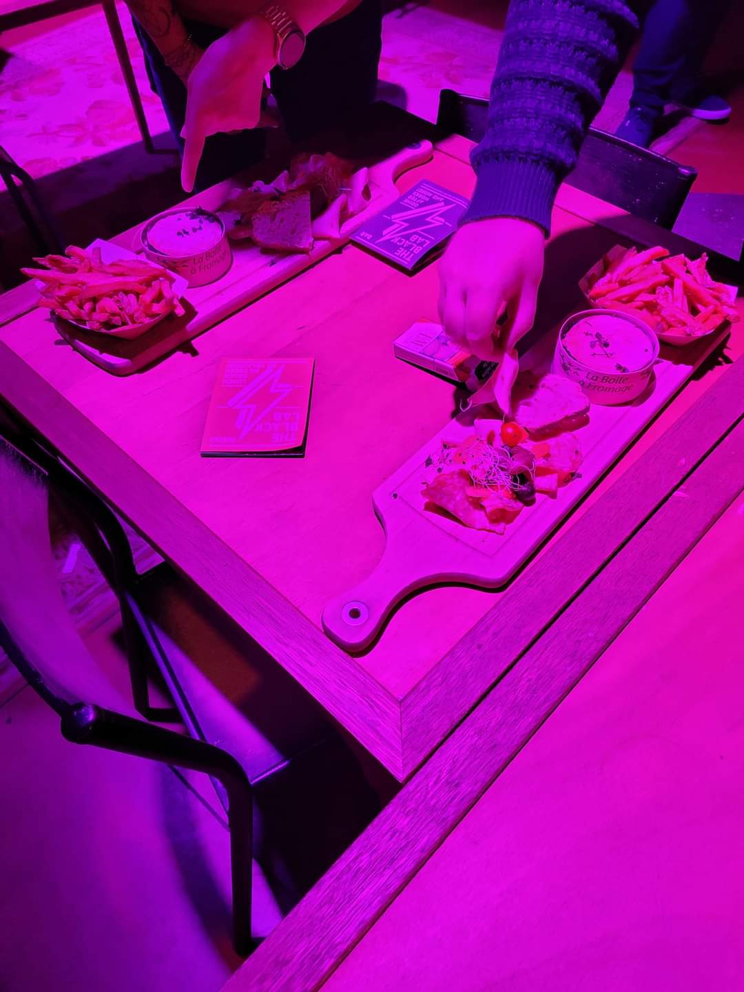 Super lieu et excellente programmation : concerts, playlists... 1ere visite, le patron tutoie comme si tu étais un habitué et te met à l'aise. Planche mixte, frites cheddar, service et ambiance musicale au top.