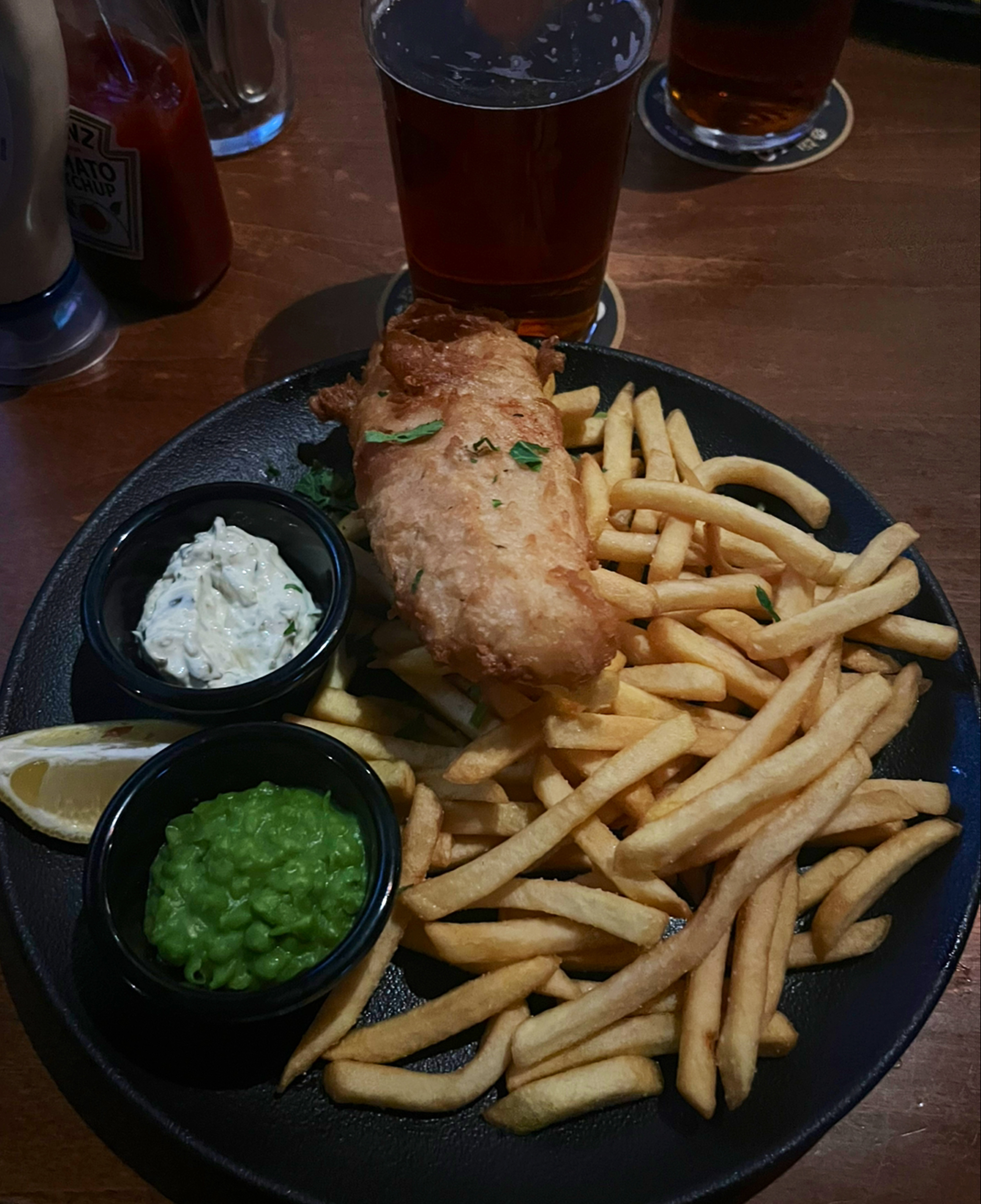 Bon endroit. Au moins, tu peux maîtriser ton anglais. Pas d'expert, mais je n'aimais pas le fish and chips. Un morceau de poisson rectangulaire. Très poissonneux, pas assez de croûte. Chips et vinaigre de malt très bons, même si je pensais que le vinaigre était sucré. Bonnes bières. La foule semblait être des habitués.