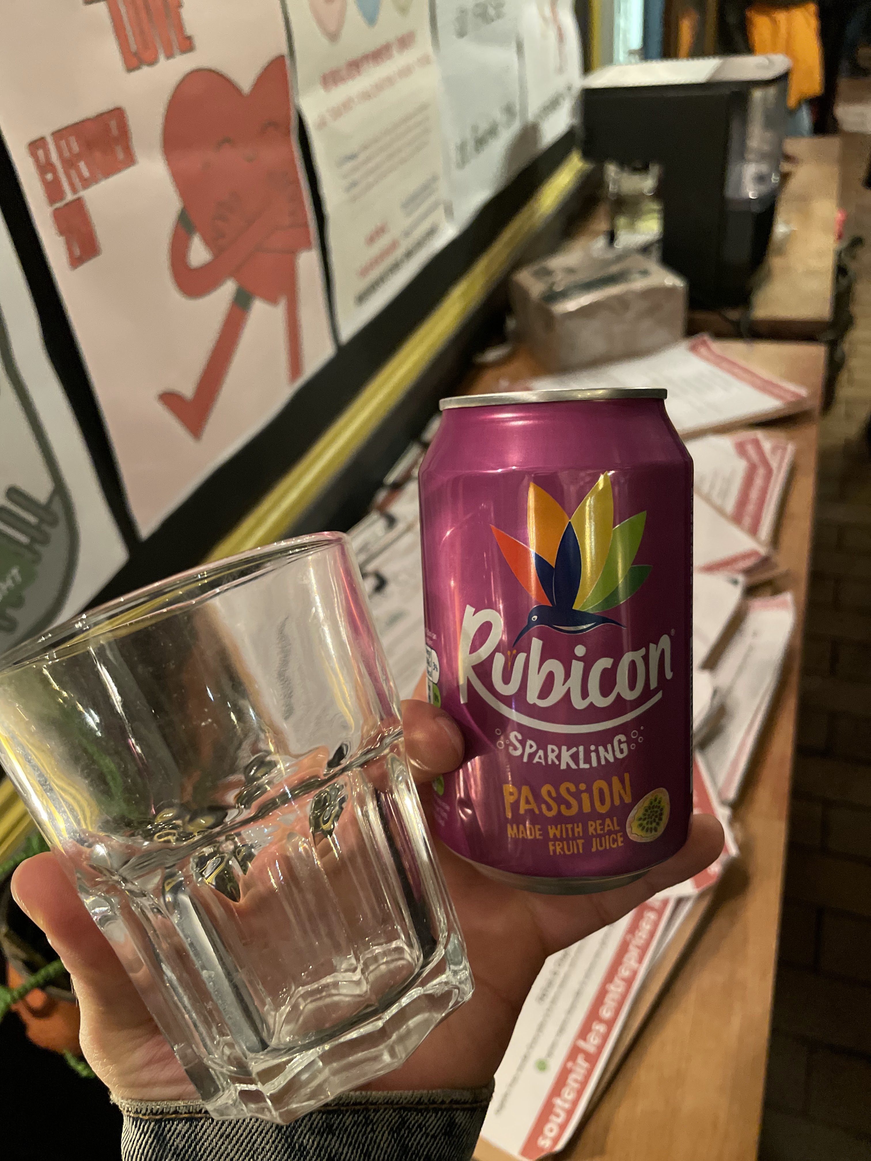 On est allés pendant le festival de court-métrage, un événement organisé par une asso internationale. Rare endroit où les gens parlent plus d’anglais que français à Clermont-Ferrand. Pour les anglophones ou les étrangers qui ne savent pas trop parler français, les francophones qui veulent s’entraîner leur anglais, ça peut être un endroit chouette. Pour ceux/celles qui ne boivent pas d’alcool : ils ont les boissons rarement vues en France aussi (N.B. Photo), et l’affiche de tigre perdu nous rend un petit sourit pour quelques secondes.