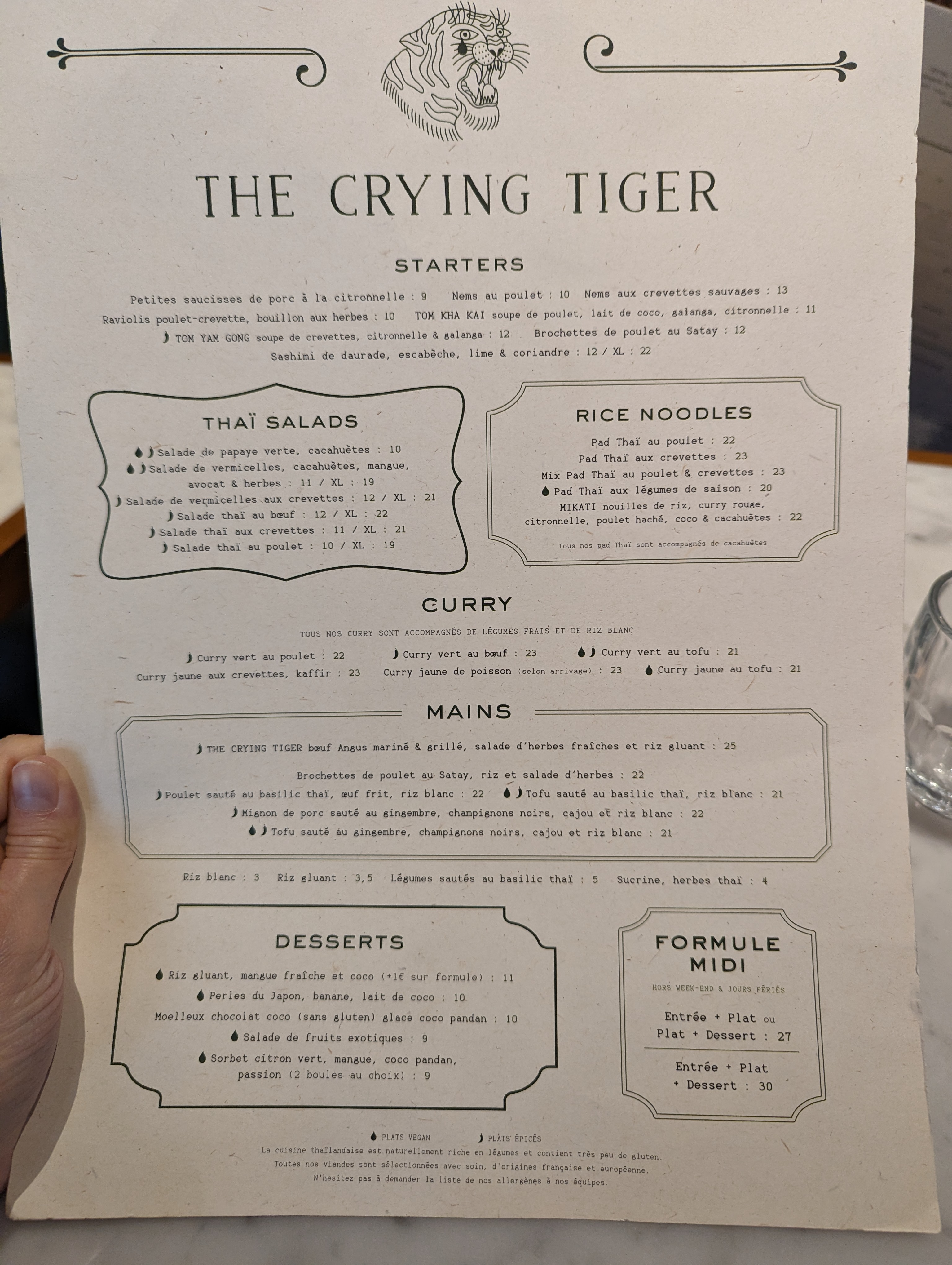 J’ai adoré ma dernière visite au crying tiger! L'ambiance du restaurant est top, belle déco, immense terrasse! La carte offre une large sélection de plats traditionnels thaïlandais, tous préparés avec des ingrédients frais et de qualité. Les portions sont généreuses, le personnel accueillant, service rapide et efficace. Je recommande vivement et vais y retourner très souvent!
