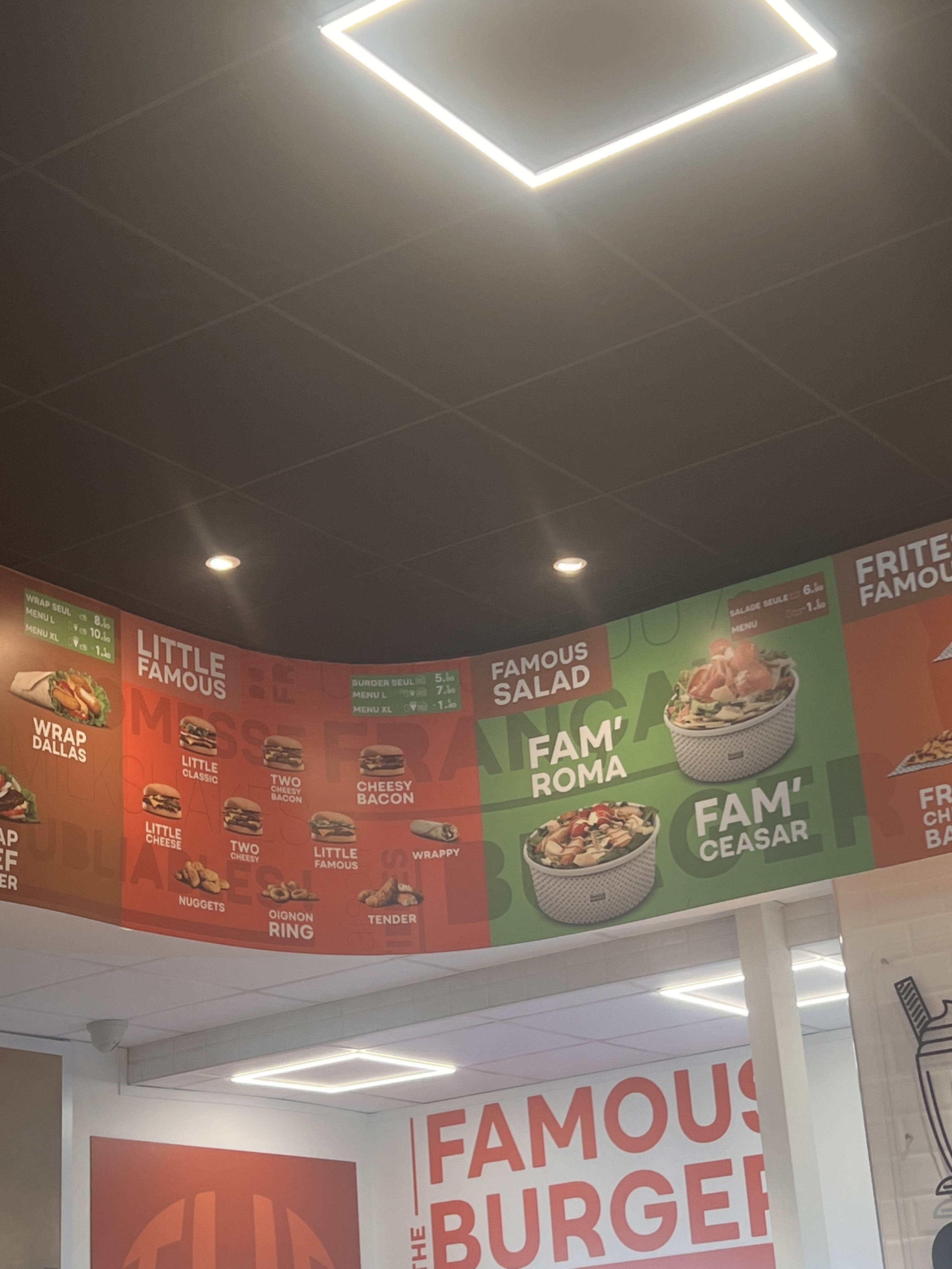Fini les mac do bourratifs, non nourrissants avec leur crêpe de steaks degueu ...Rapport qualité prix, chez famous burger, des vrais steaks de viande de boeufs... vous ressortez bien calé et ravi d avoir mangé du bon... Et n oublions pas les vraies frites maison...