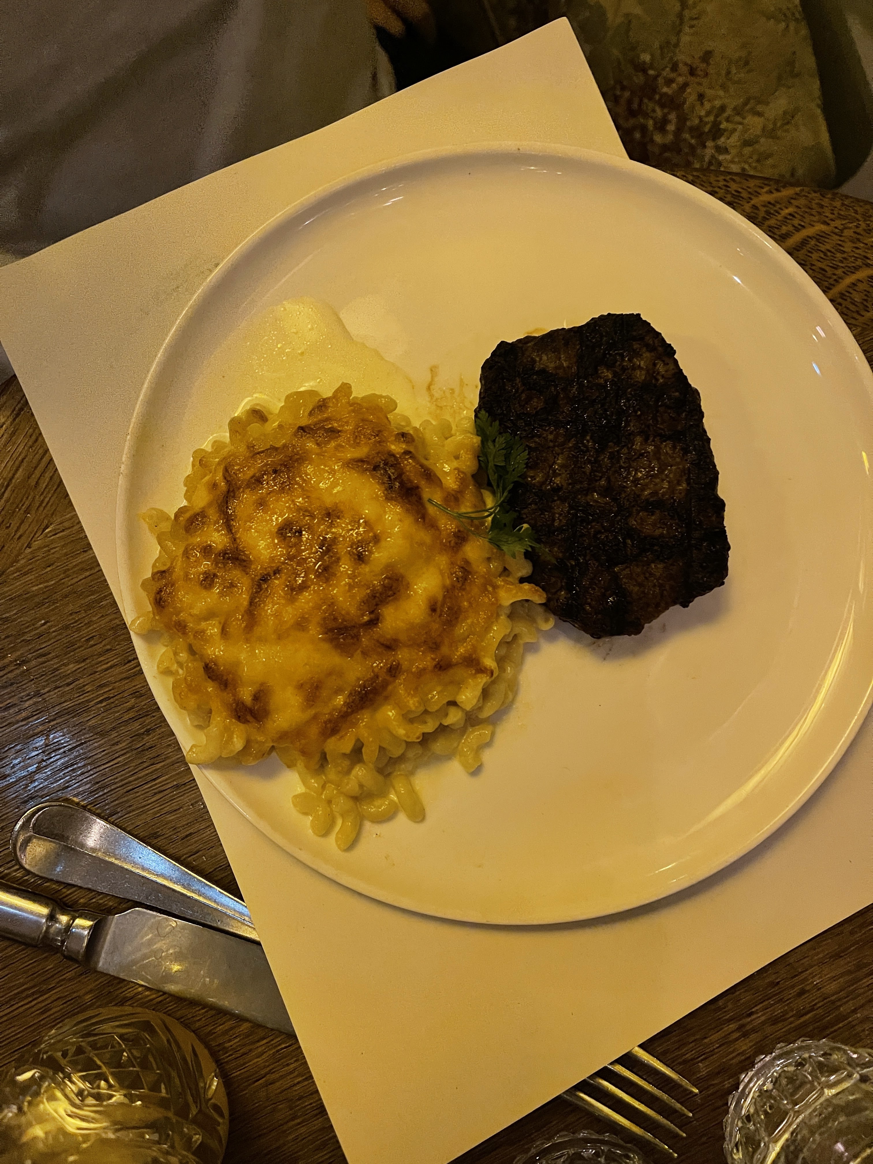 J'ai adoré mon apéritif, j'ai aimé mon plat principal. Je n’étais pas fou du côté principal (macaroni au fromage). J'ai apprécié le dessert et ma boisson. Pour moi, la nourriture était plutôt bonne, voire excellente. Ne justifie pas vraiment le prix. L'ambiance était positive et le service était très attentionné. Je dirais un bon endroit d’occasion, mais pas forcément un lieu d’occasion.