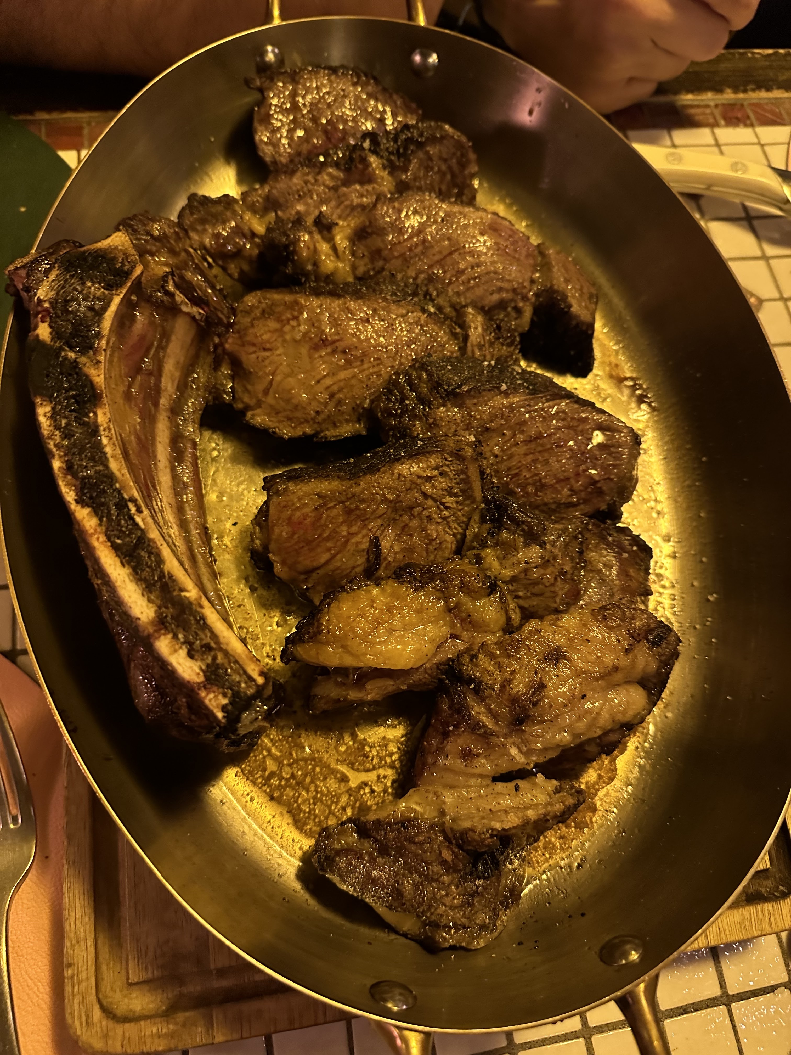 L'endroit est magnifique, a vraiment l'air cher et bien pensé. La seule chose que la nourriture n’était pas aussi bonne que l’endroit. J'ai eu le Tigre qui pleure et la viande avait beaucoup de nerfs pas facile à mâcher, le fondant au chocolat n'était pas fondant c'était juste un gâteau au chocolat ordinaire, on voit aussi que les frites étaient congelées. Je recommanderai de commander la côte ou l'entrecôte, tout le reste n'était pas terrible. Nous apercevons également le cuisinier du désert qui se lèche le doigt et touche du gâteau après sans se laver les mains. Nous n'y retournerons pas.