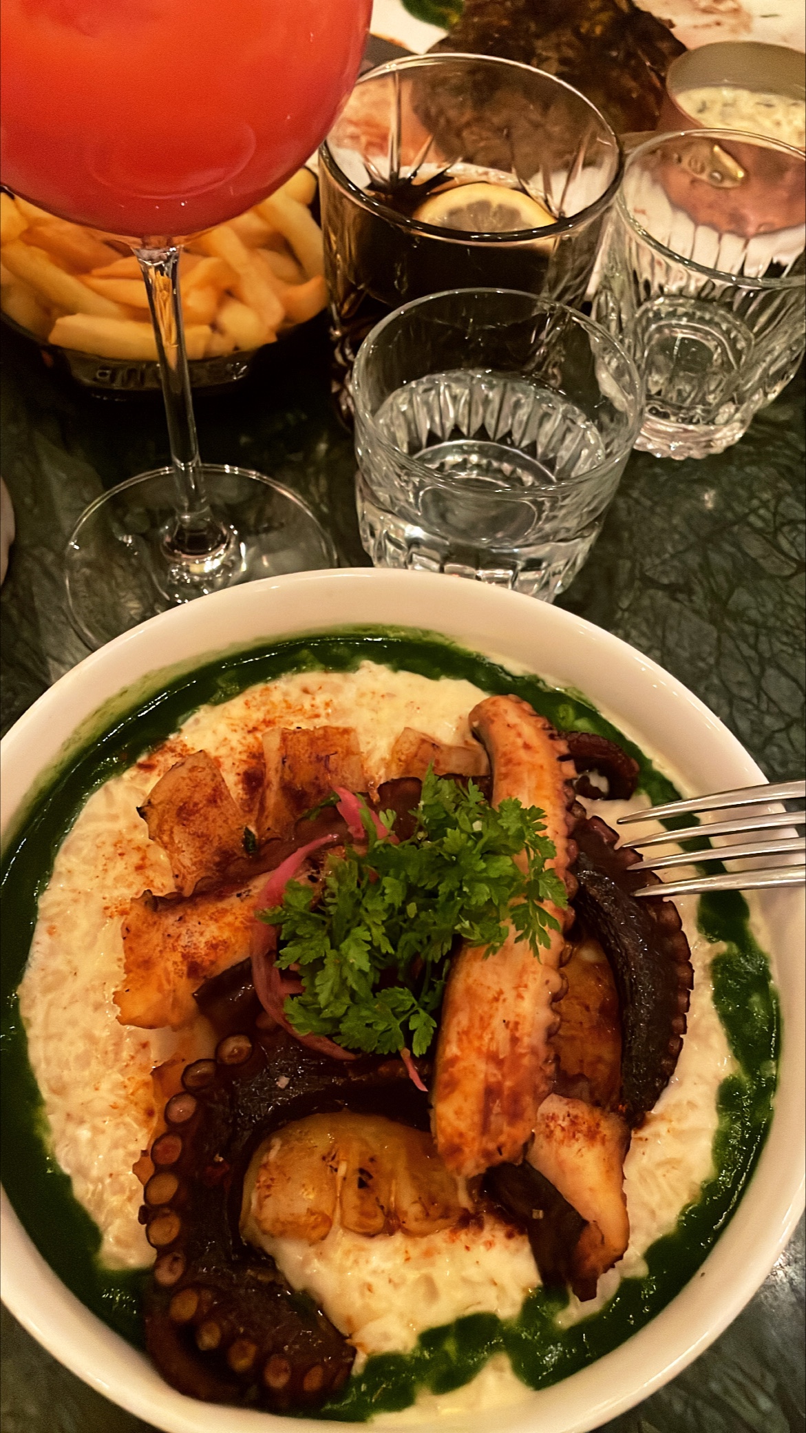 Nourriture excellente, j'ai adoré le poulpe grillé à la perfection ! Tout était savoureux et d'une grande qualité. Cependant, la pièce était trop chaude, réfléchissez-y avant de venir par une journée d'été ensoleillée.