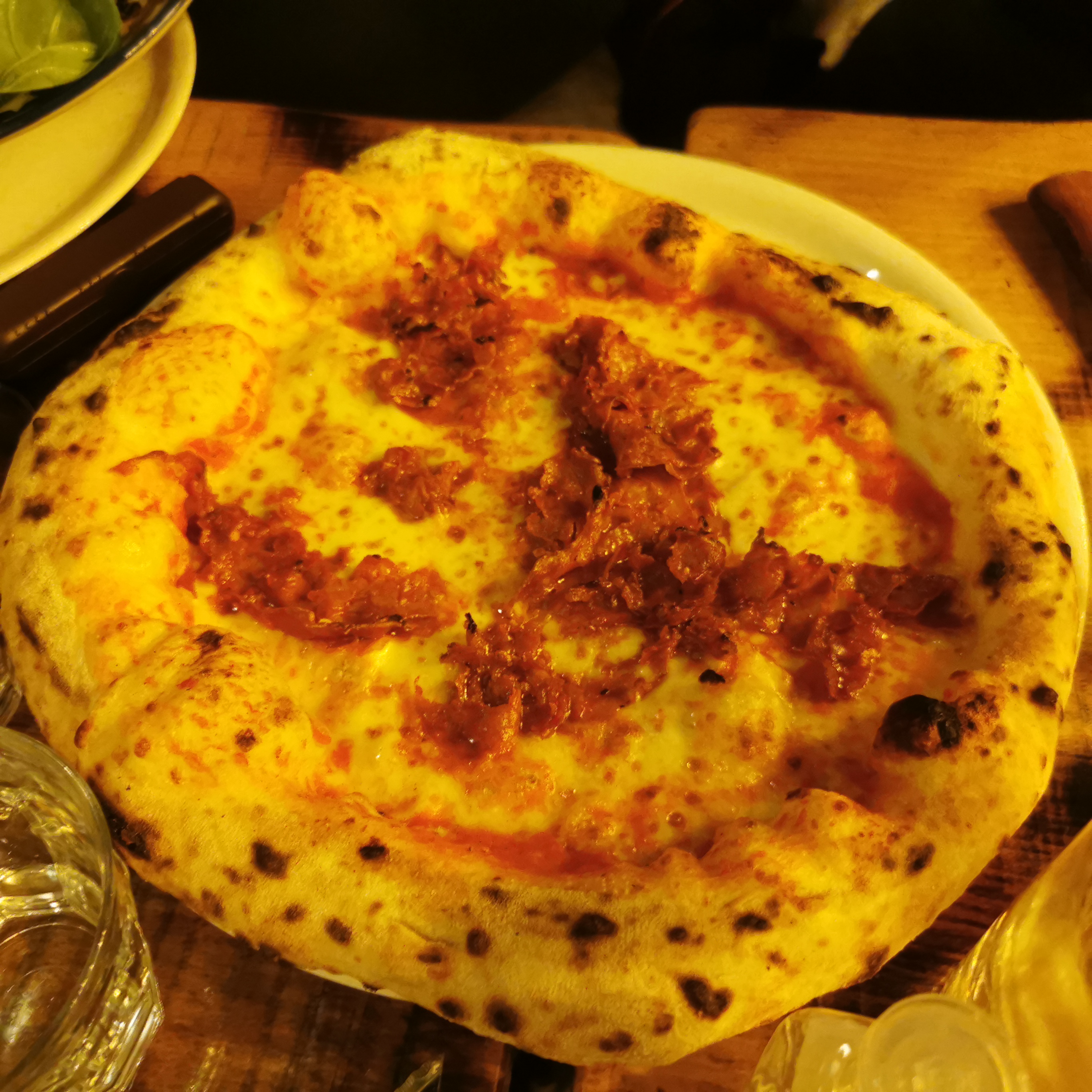 Pizze à pâte épaisse et moelleuse ! Personnellement j'adore ! 💕 Le service était super ! Le cadre est sympa, on a bien mangé, bien bu et passé un bon moment 🙂on reviendra, c'est sûr ! ( En plus c'est ouvert jusque tard !)