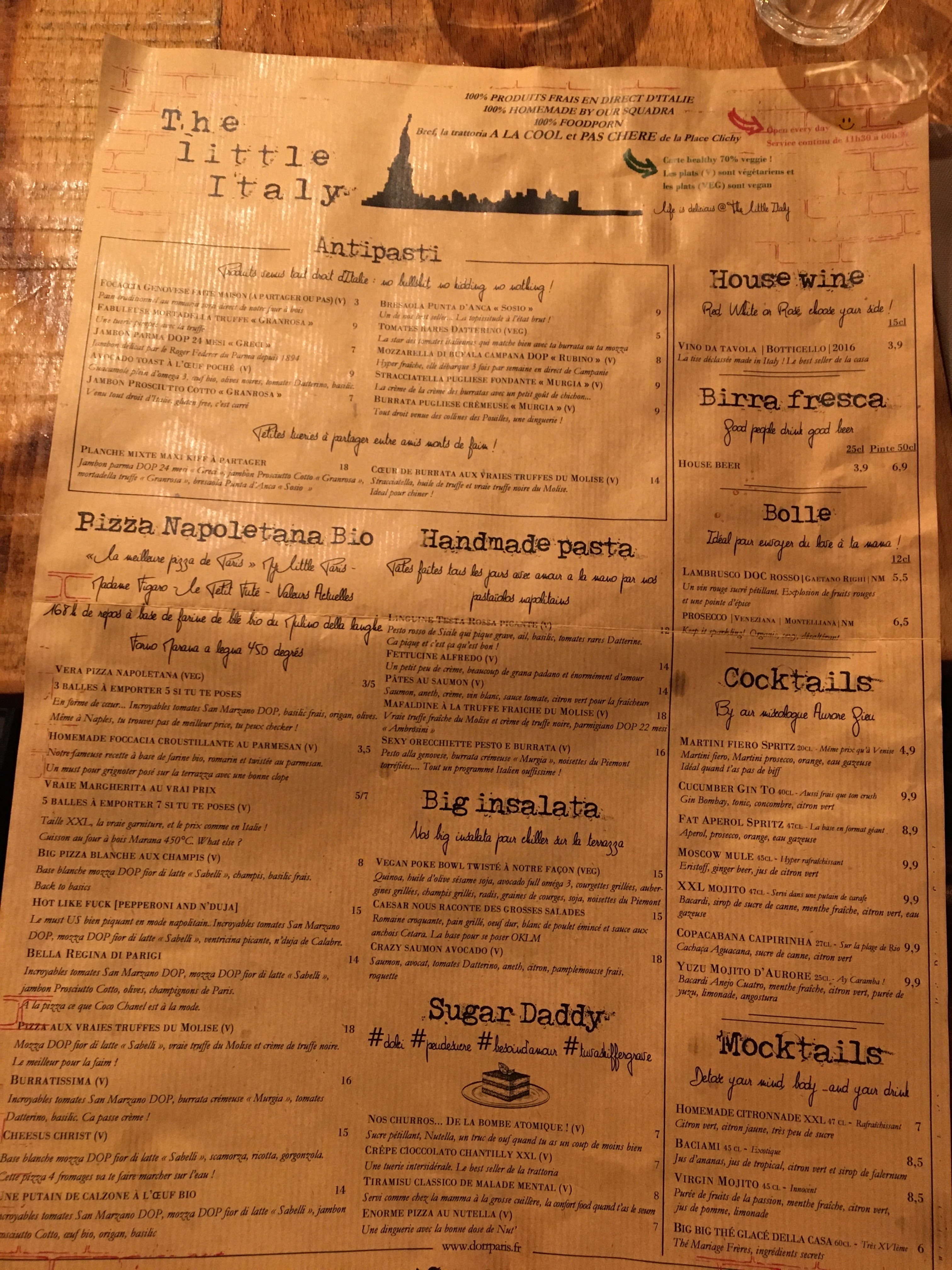 Dans ce lieu à la décoration atypique il est possible de manger de très bonnes pizzas et pâtes tout en sirotant un verre de Prosecco. En plus des plats, il y a aussi une bonne variété de desserts, notamment le tiramisu qui est très bon. Le service a été bon, malgré l’attente, notre serveur a été très sympathique. Même s’il n’y a pas grand chose à redire sur la qualité des plats, les prix sont eux trop élevés. De plus, nous étions positionnés proche de la porte d’entrée qui est restée ouverte toute la soirée donc nous avons eu froid. Enfin, en situation de pandémie, personne ne portait le masque et les gestes barrières n’étaient clairement pas respectés.