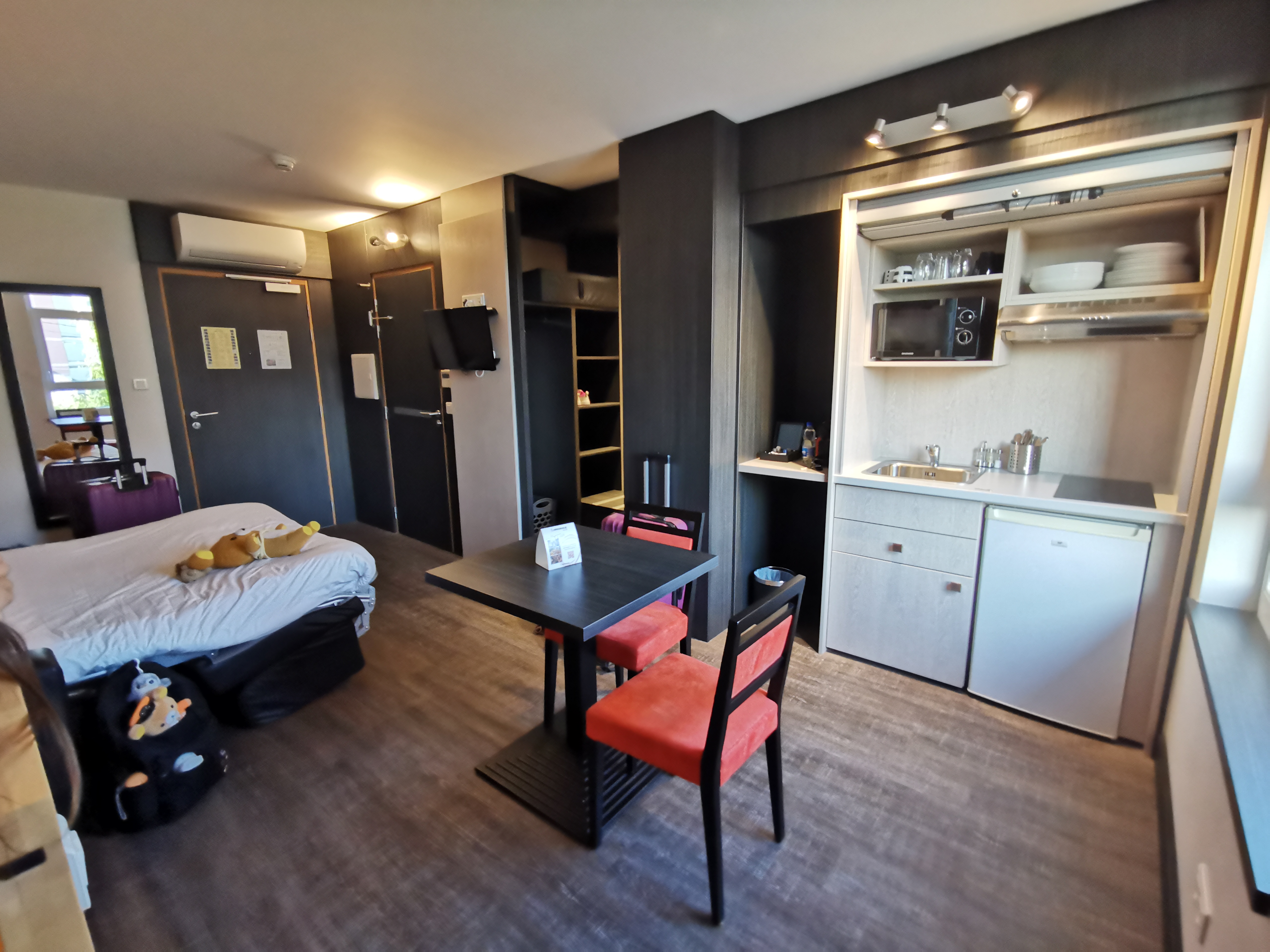 Nous venons de séjourner 1 nuit dans cet établissement. Nous avons été très satisfait par les prestations de la chambre duplex. Grande chambre avec un canapé lit et une télé, ainsi qu'un lit king size à l'étage avec une grande télé également. Une toilette au rdc et une autre à l'étage avec la salle de bains. Le coin cuisine a tout ce qu'il faut : 1 plaque de cuisson, micro onde, frigo, machine nespresso avec capsules, et couverts, assiettes. Nous n'avons vraiment rien à redire ! C'était très bien ! Dans les parties communes, baby foot, salle avec des livres à disposition. Nous reviendrons !
