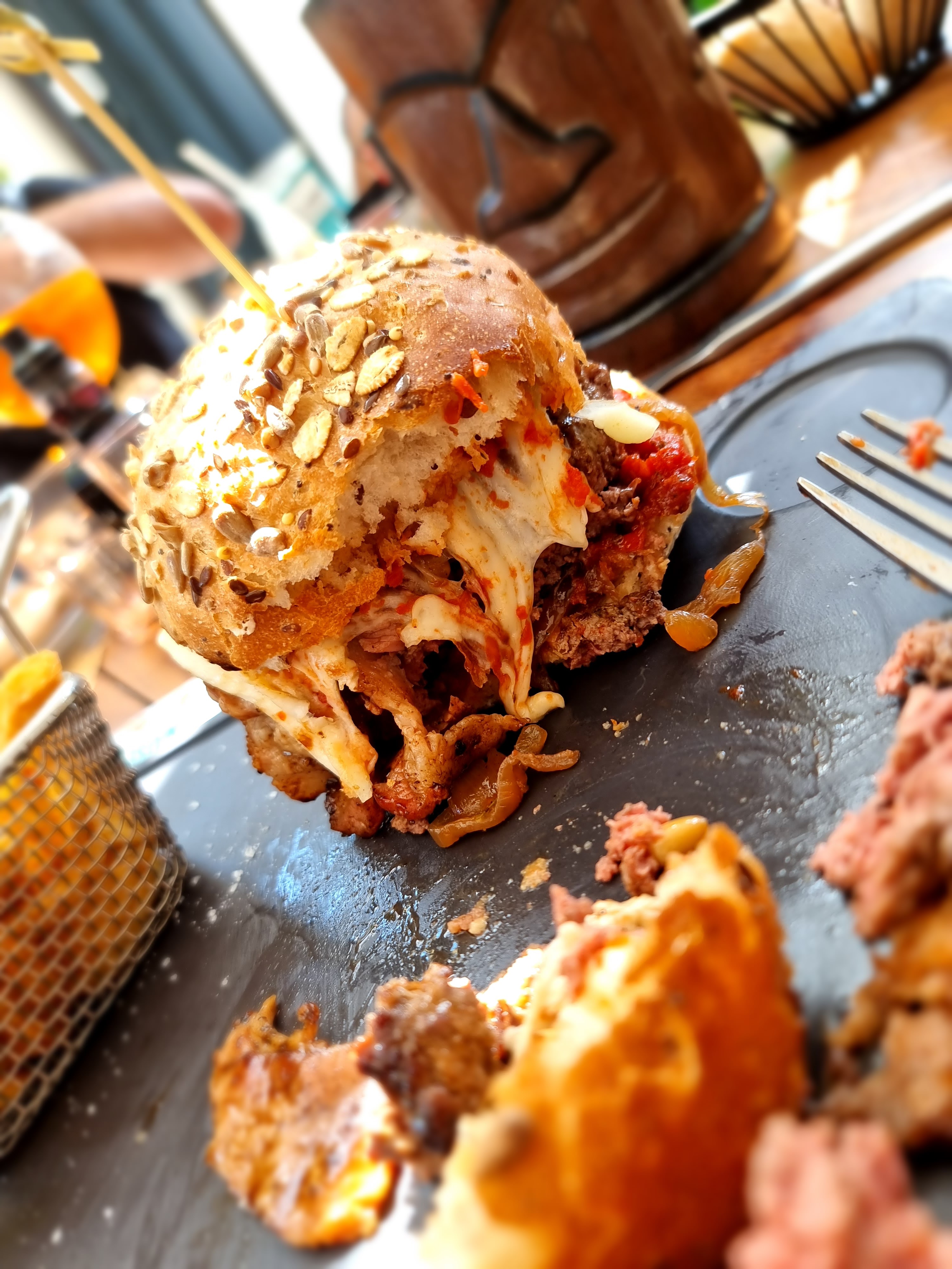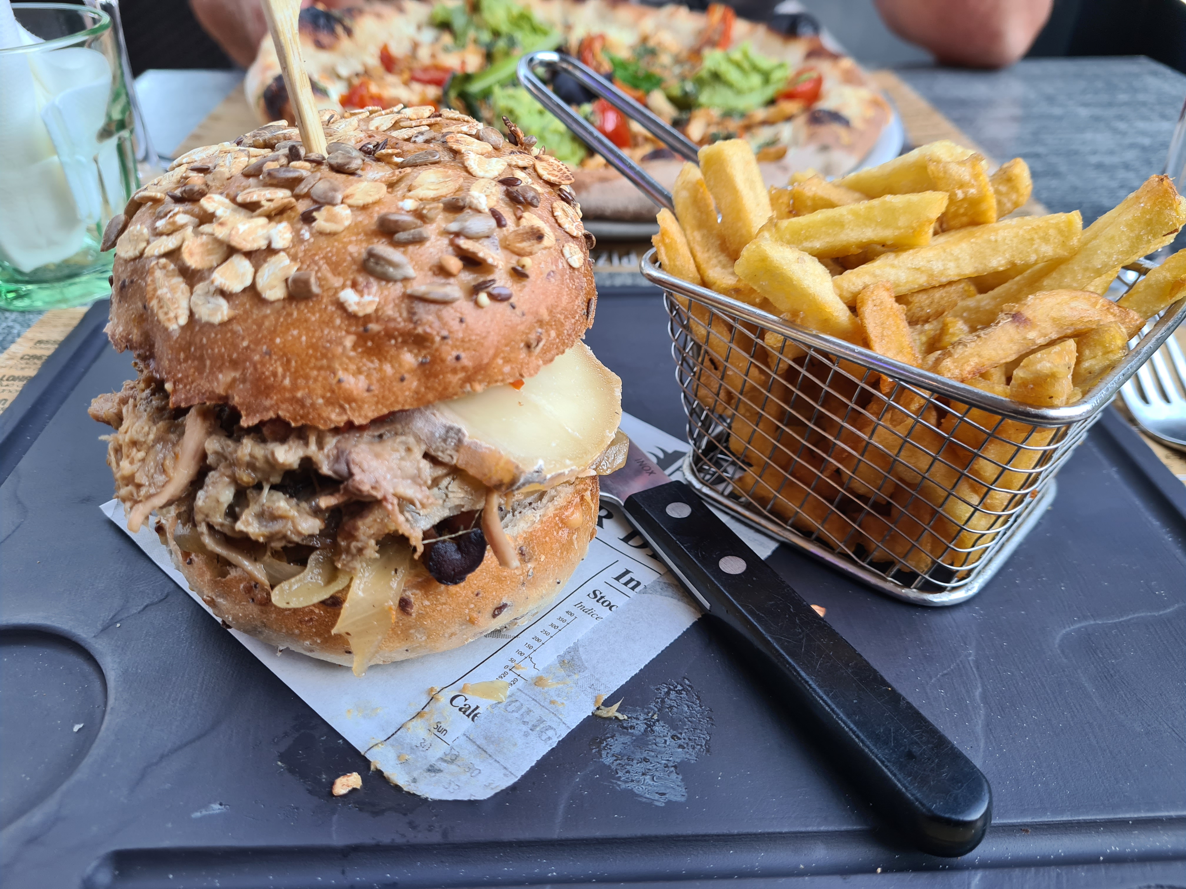 Nous avons été 2 à commander le burger Cabri et avons demandé 2 cuissons différentes (à point et saignant) Nous nous sommes rendus compte à la moitié du burger qu'on ne nous avait pas demandé quel burger était à qui. Il se trouve que nous 2 burger étaient en réalité à point. Malgré ma déception sur la cuisson, le burger était bon. Par la suite, nous avons dû demander à plusieurs reprise pour avoir 1 carafe d'eau. Enfin, nous n'avons pas trouvé logique que les plats chauds soient servis avant les plats froids, sachant que nous avons attendu longtemps avant que les salades soient servies.