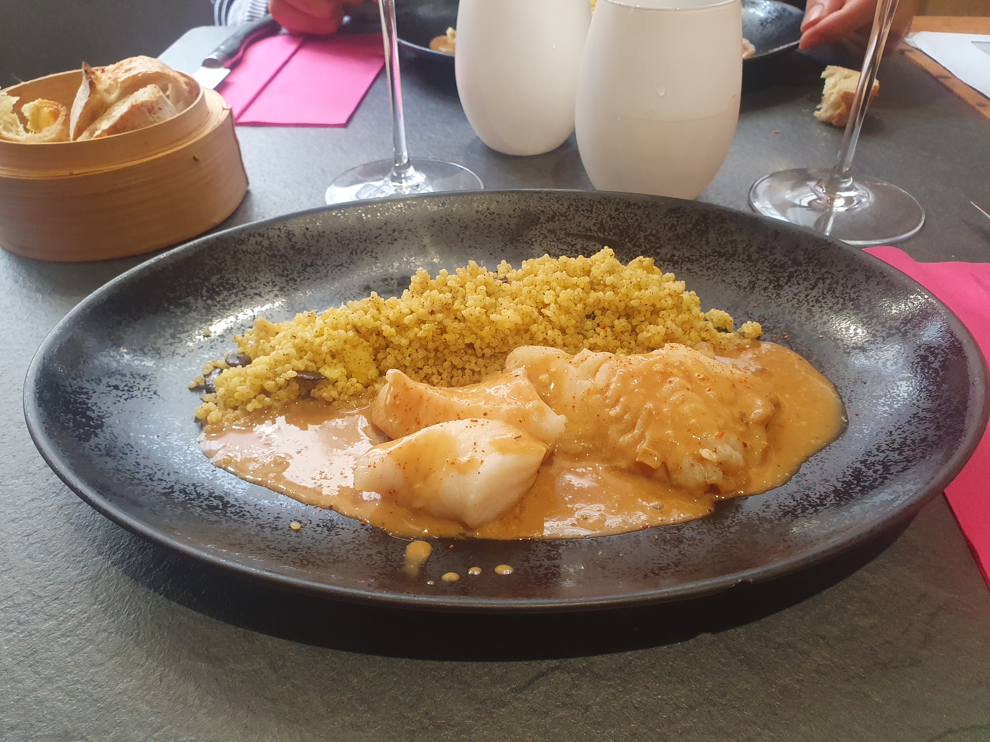 Accueil trés sympathique par le patron qui nous fait partager sa passion de la cuisine et des bons produits Nous nous sommes régalés avec le menu du jour et en particulier le savoureux poisson et sa sauce au curcuma et dés de légumes croquants !!un régal nous reviendrons avec plaisir